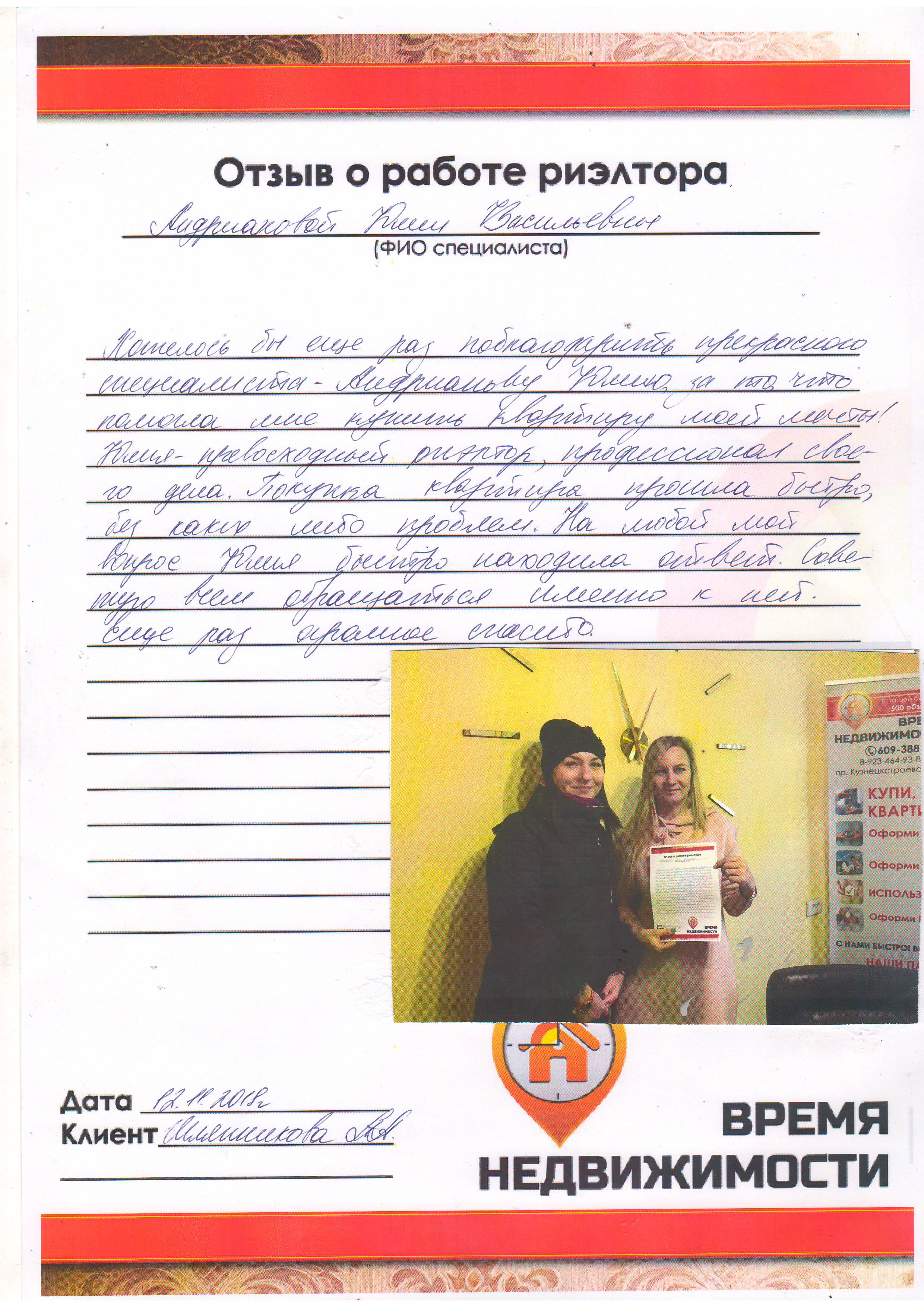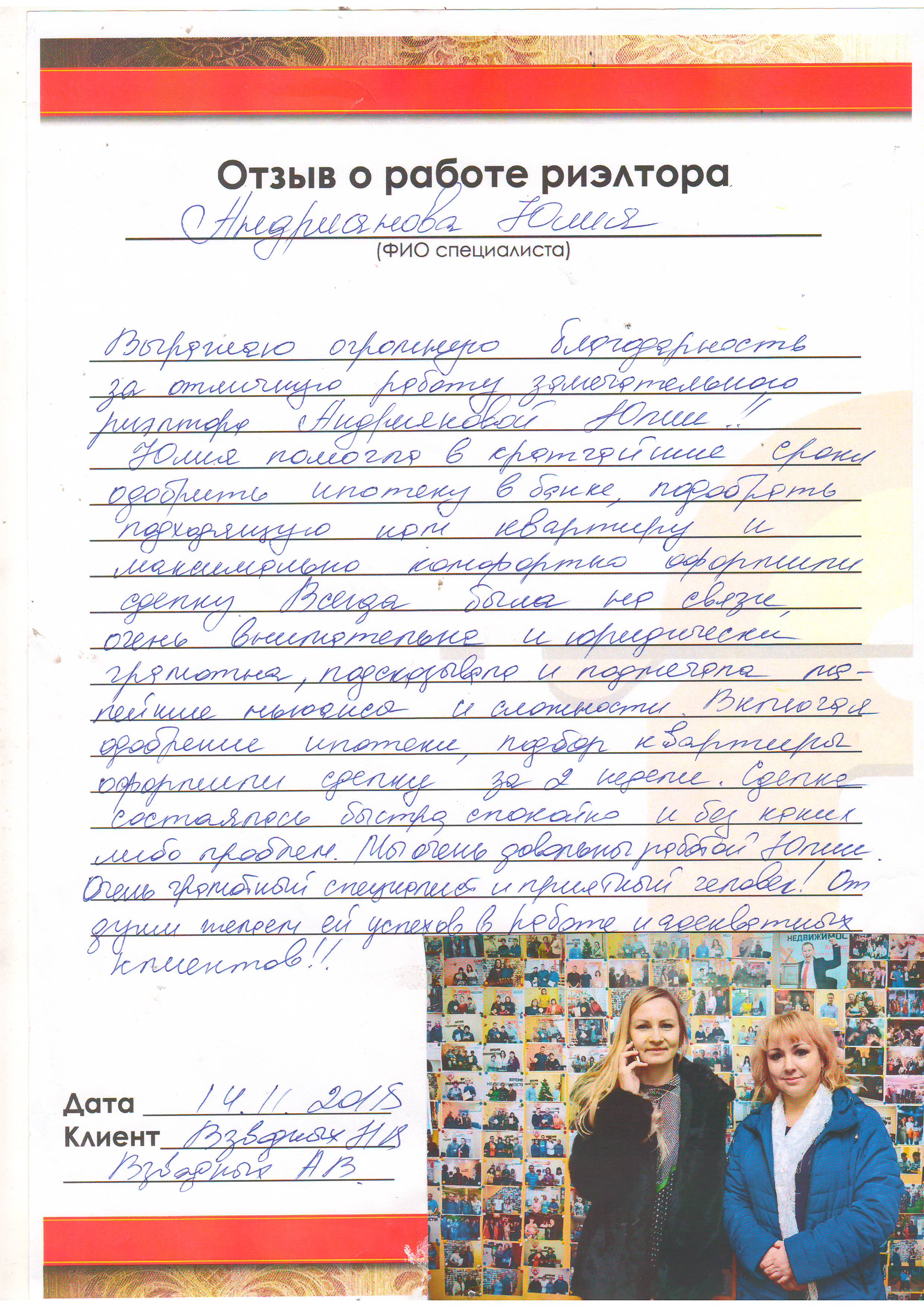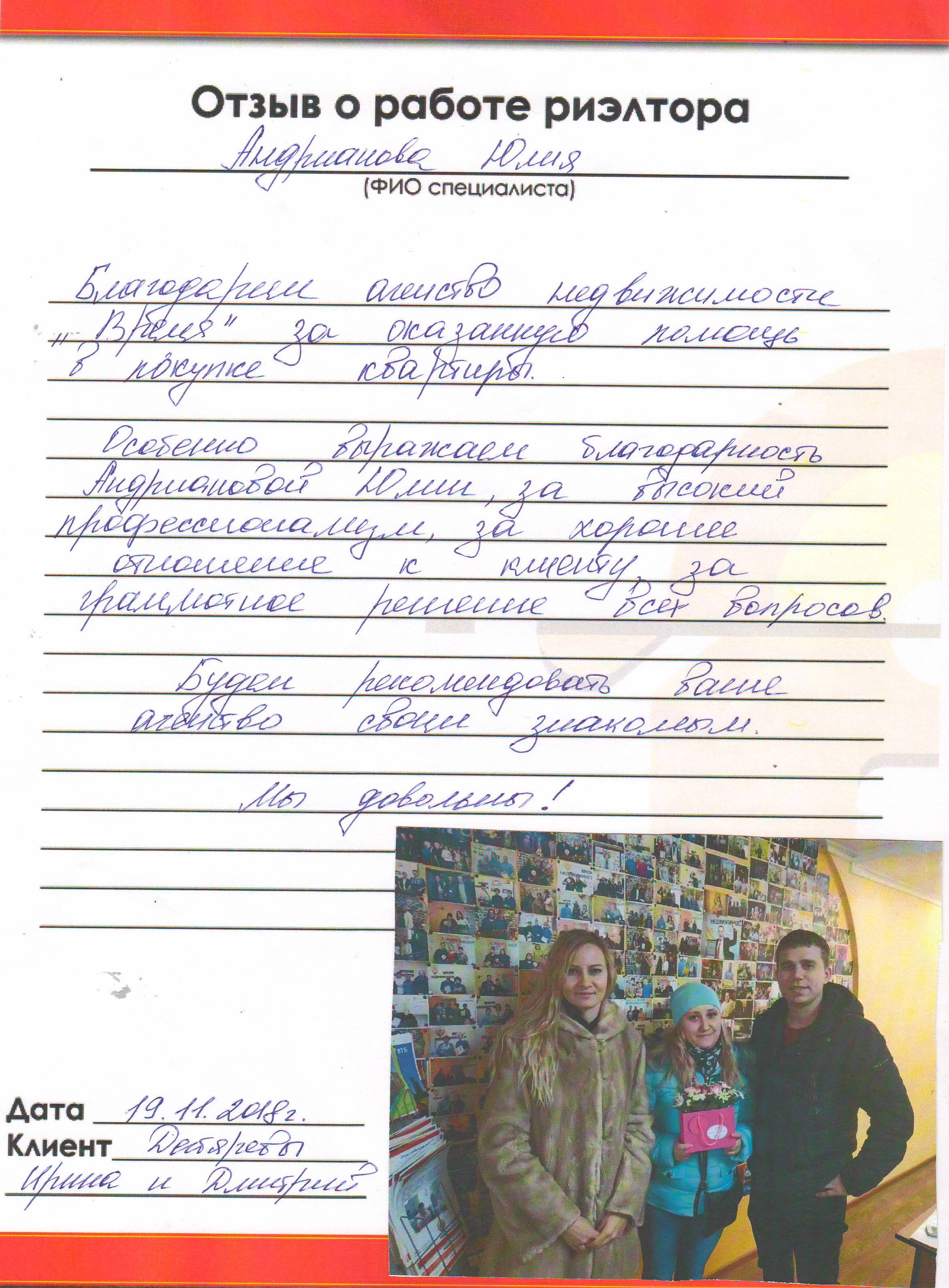 Благодарим агентство за оказанную помощь в покупке квартиры. Особенно выражаем благодарность Андриановой Юлии, за высокий профессионализм, за хорошее отношение к клиенту, за грамотное решение всех вопросов. Будем рекомендовать ваше агентство своим знакомым. Мы довольны!