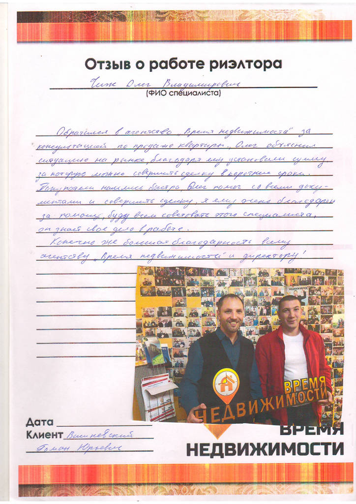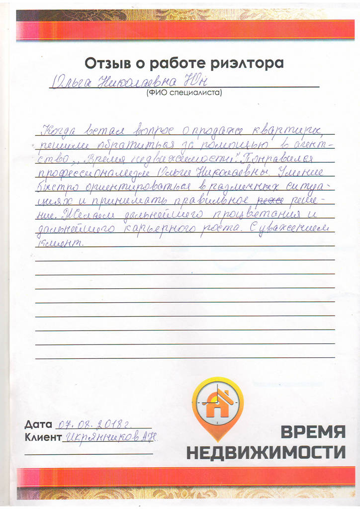 Когда встал вопрос о продаже квартиры, решили обратиться за помощью в агентство "Время недвижимости". Понравился профессионализм Ольги Николаевны. умение быстро ориентироваться в различных ситуациях и принимать правильное решение. Желаем дальнейшего процветания и карьерного роста.