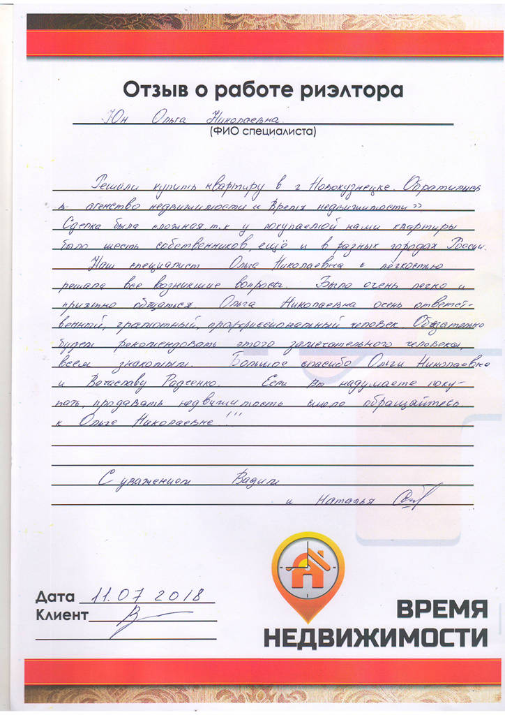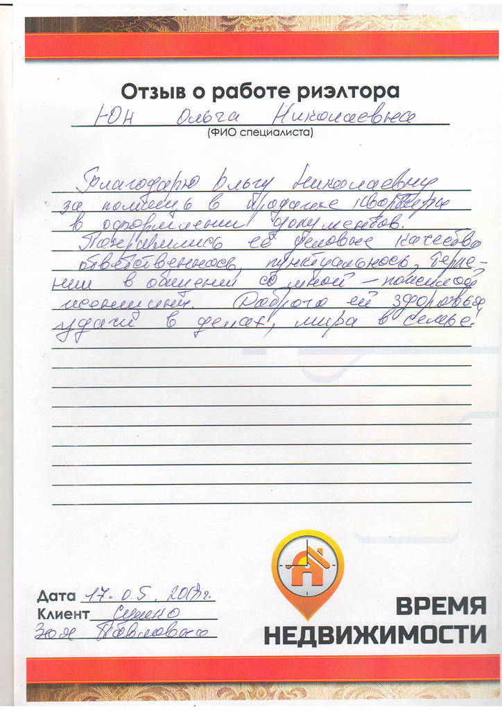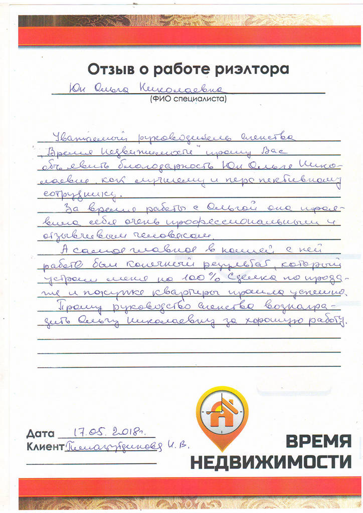 Уважаемый руководитель агентства "Время недвижимости", прошу Вас объявить благодарность Юн Ольге Николаевне, как лучшему и перспективному сотруднику. За время работы с Ольгой, она проявила себя очень профессиональным и отзывчивым человеком. А самое главное в нашей с ней работе - конечный результат, который устроил меня на 100%. Сделка по продаже и покупке квартиры прошла успешно.
