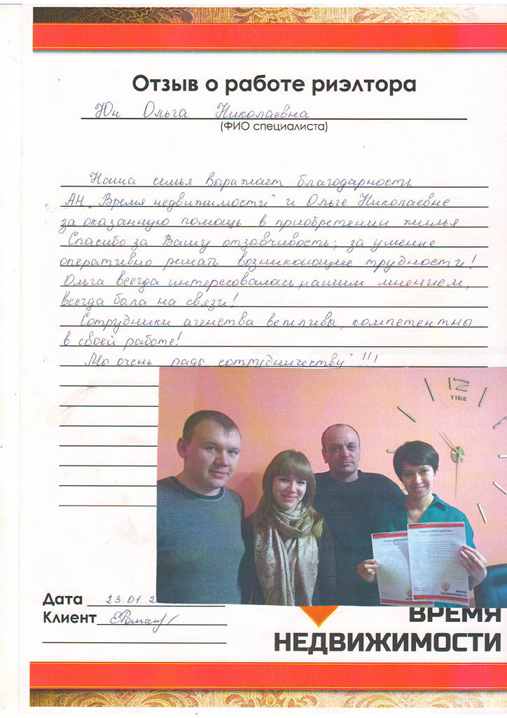 Наша семья выражает благодарность АН "Время недвижимости" и Ольге Николаевне за оказанную помощь в приобретении жилья. Спасибо за Вашу отзывчивость, за умение оперативно решать возникающие трудности! Ольга всегда интересовалась нашим мнением, всегда была на связи! Сотрудники агентства вежливые, компетентны в своей работе! Мы очень рады сотрудничеству!