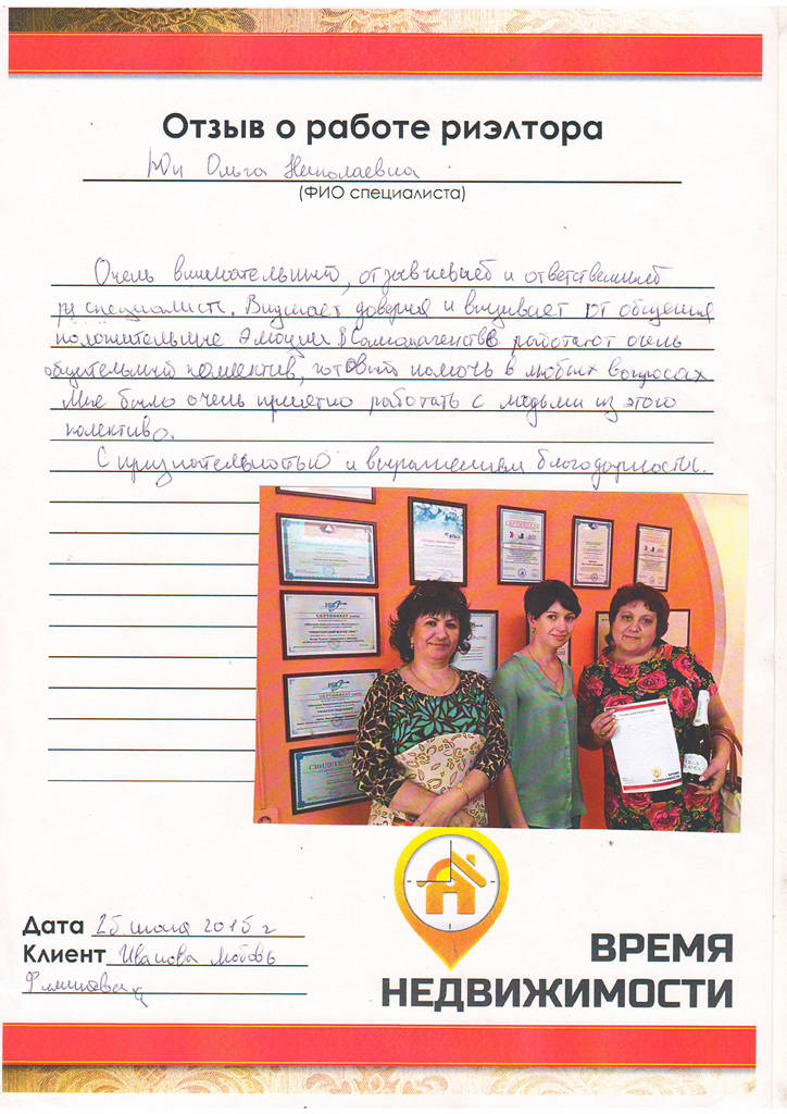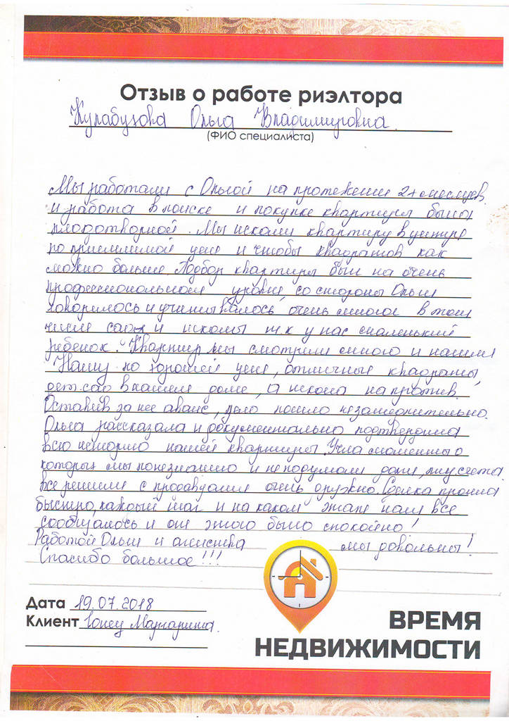 Спасибо большое за профессионализм в своем деле! Очень четко, с искренней симпатией все нам рассказала и показала. В любой момент, когда я звонила, слышала приятный добрый голос Оксаны. Она полностью сопровождала процесс сделки. Буду рекомендовать вас друзьям и знакомым.
