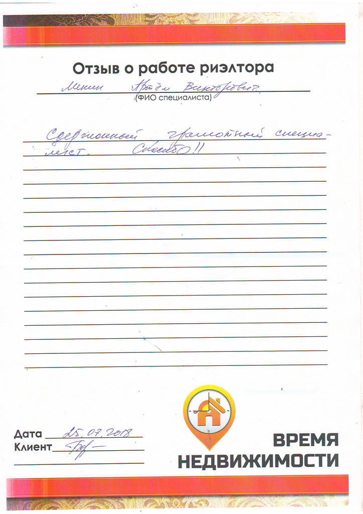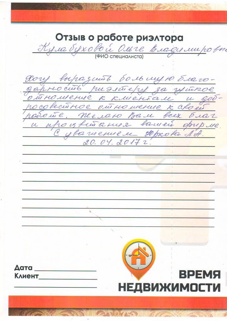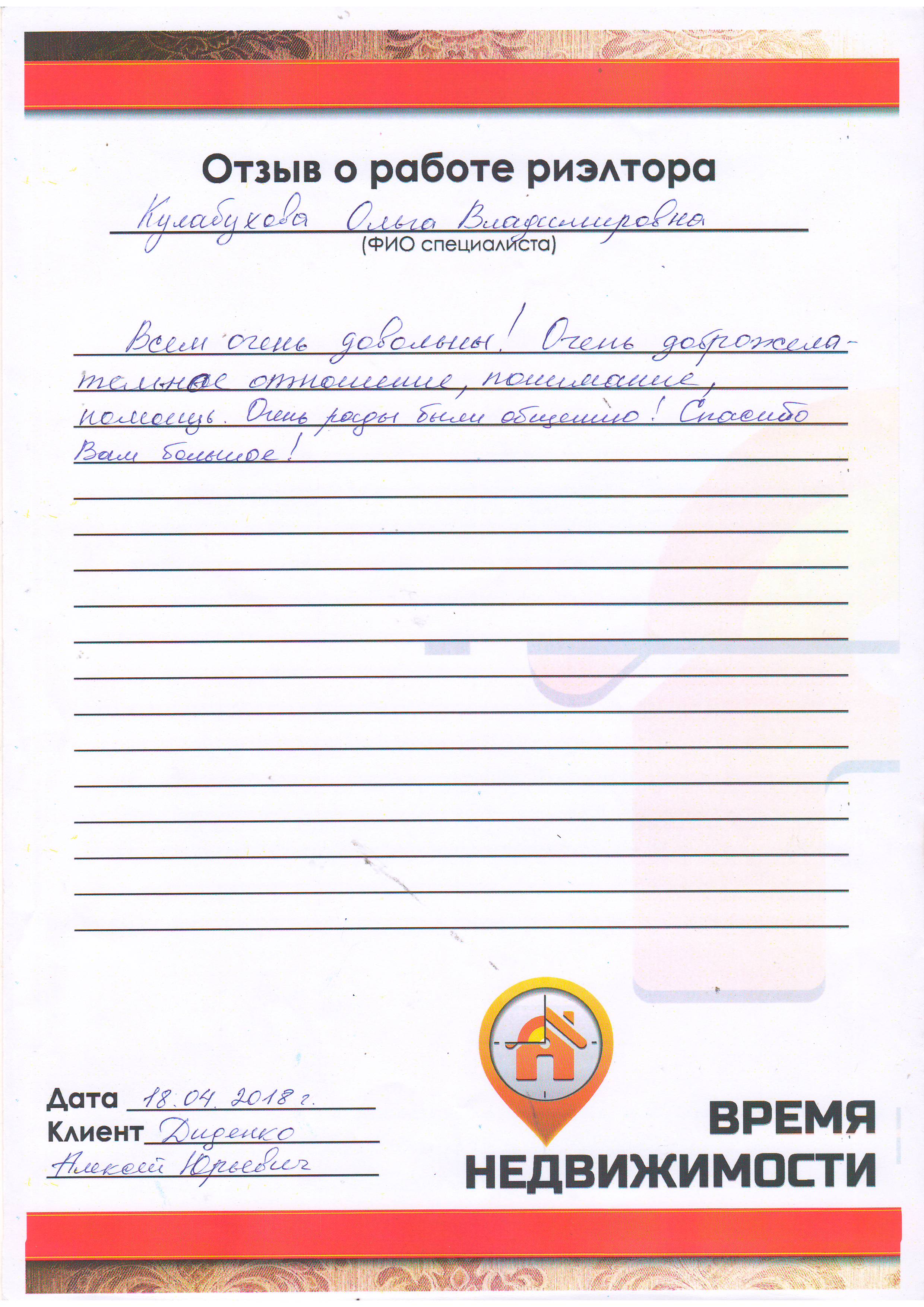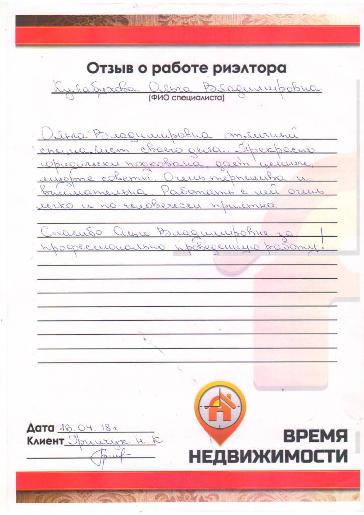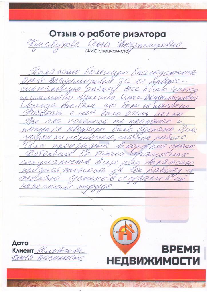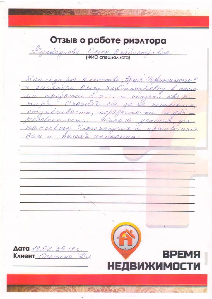 Благодарю агентство "Время недвижимости" и риэлтора Ольгу Владимировну в помощи в продаже СРТ и покупки квартиры. Спасибо ей за понимание, отзывчивость, порядочность и добросовестность. Желаю успехов, финансового благополучия и процветания вам и вашей компании.