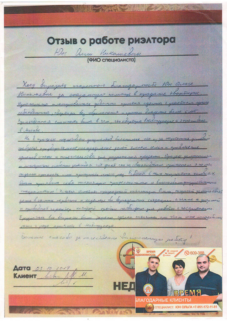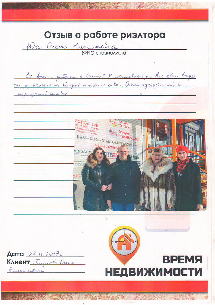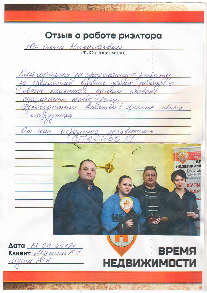 При покупке недвижимости обратились в АН "Время Недвижимости", где с нами работала специалист Юн Ольга. Хотелось бы отметить доброжелательное отношение к клиенту и профессионализм. Кроме того, все было сделано очень быстро, мы довольны, что обратились к вам. Будем рекомендовать всем знакомым! Спасибо!!!
