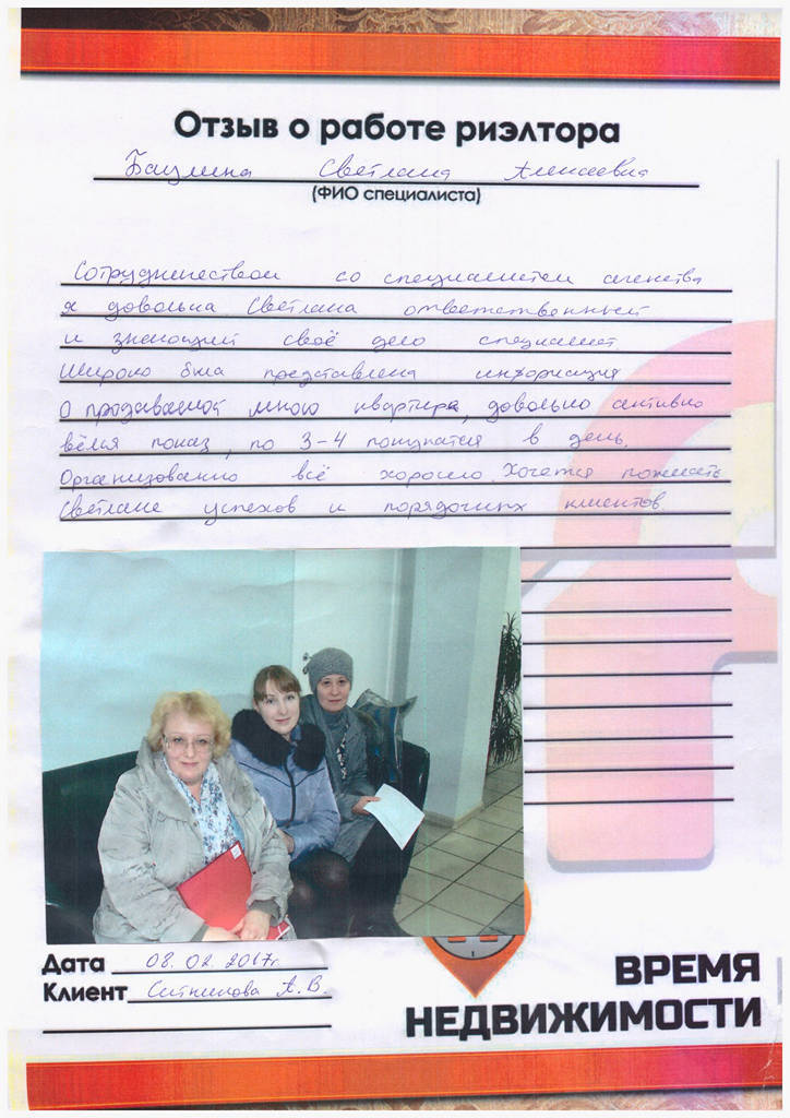 Сотрудничество со специалистом агентства я довольна. Светлана ответственный и знающий свое дело специалист. Широко была представлена информация о, продаваемой мной, квартире, довольно активно велся показ, по 3-4 посетителя в день. Организовано все хорошо. Хочется пожелать Светлане успехов и порядочных клиентов.