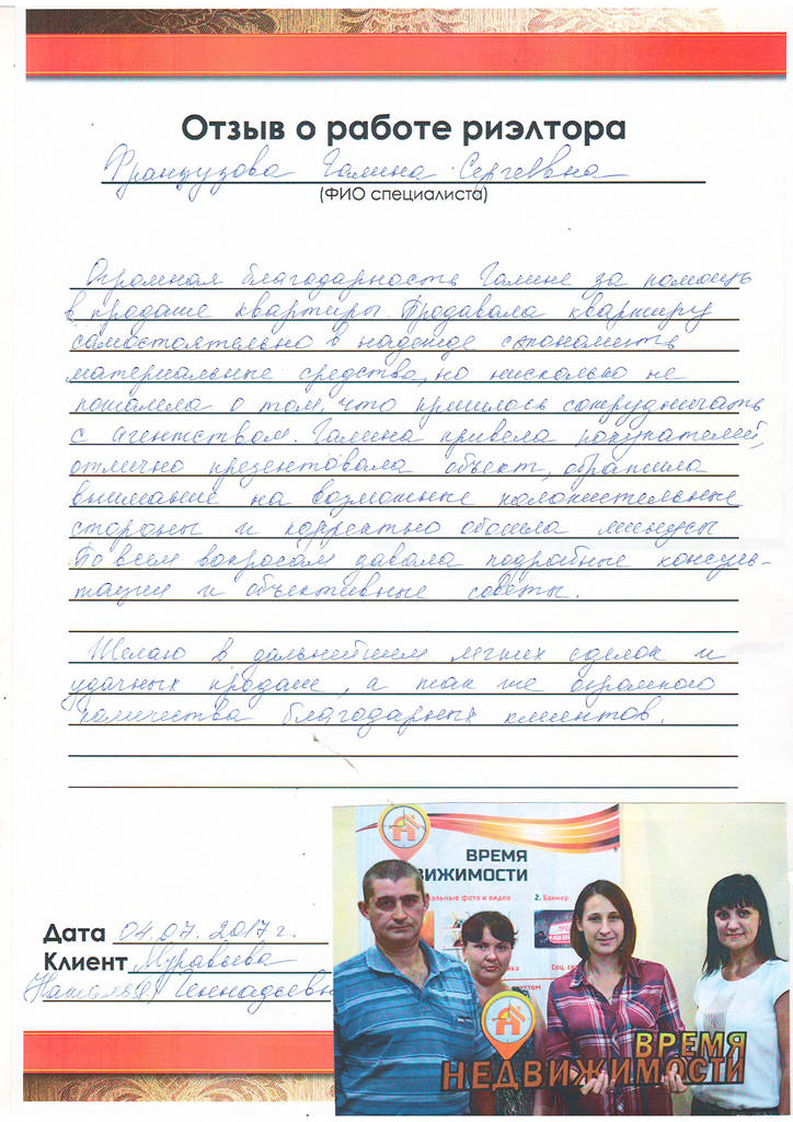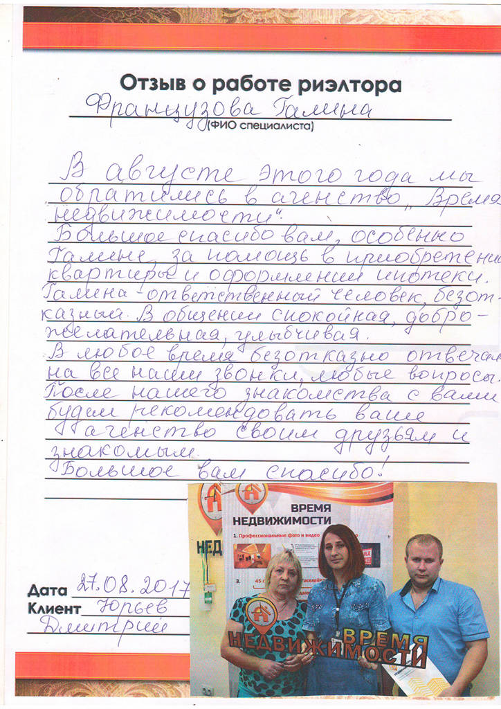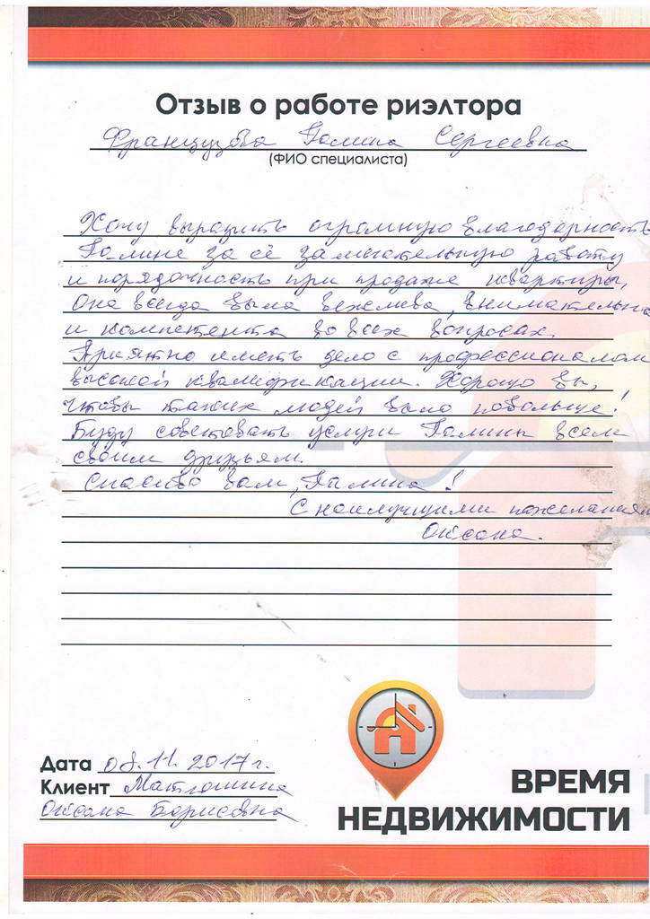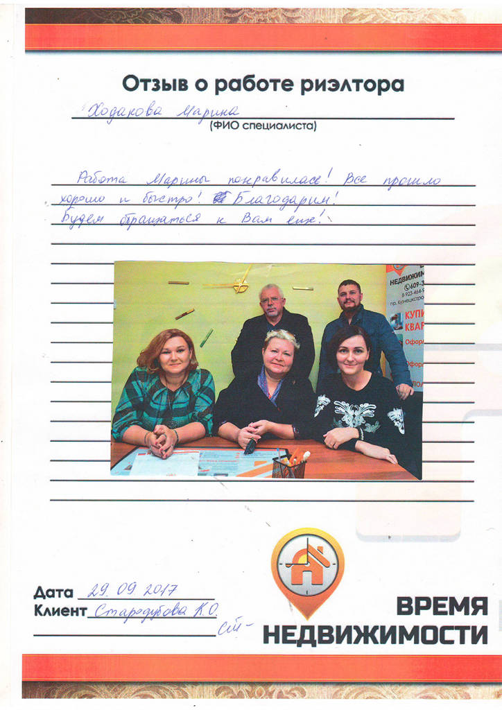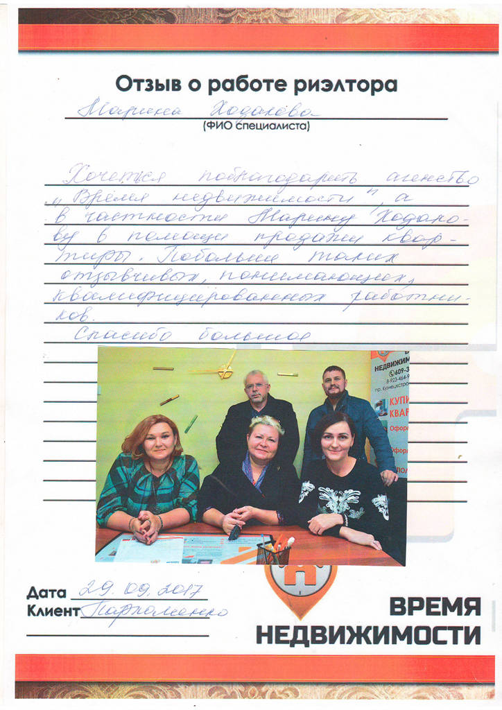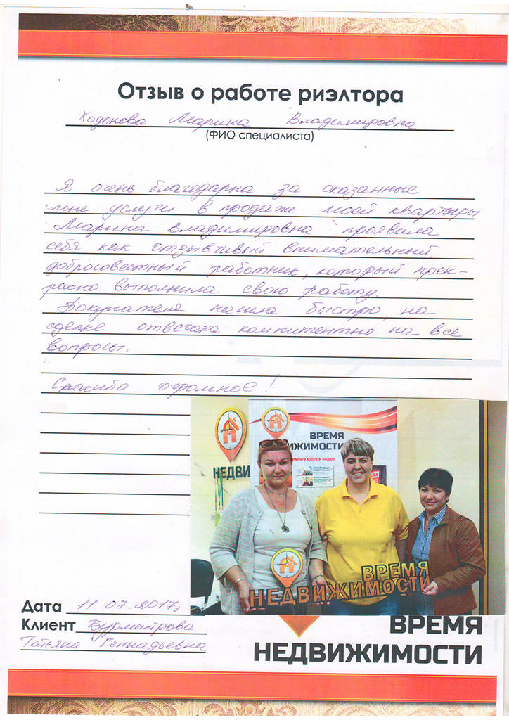 Хочется поблагодарить агентство "Время недвижимости", и в честности Марину Ходакову за помощь в продаже квартиры. Побольше бы таких отзывчивых, понимающих, квалифицированных работников. Спасибо большое!