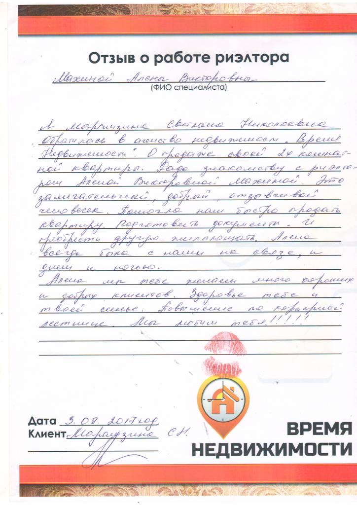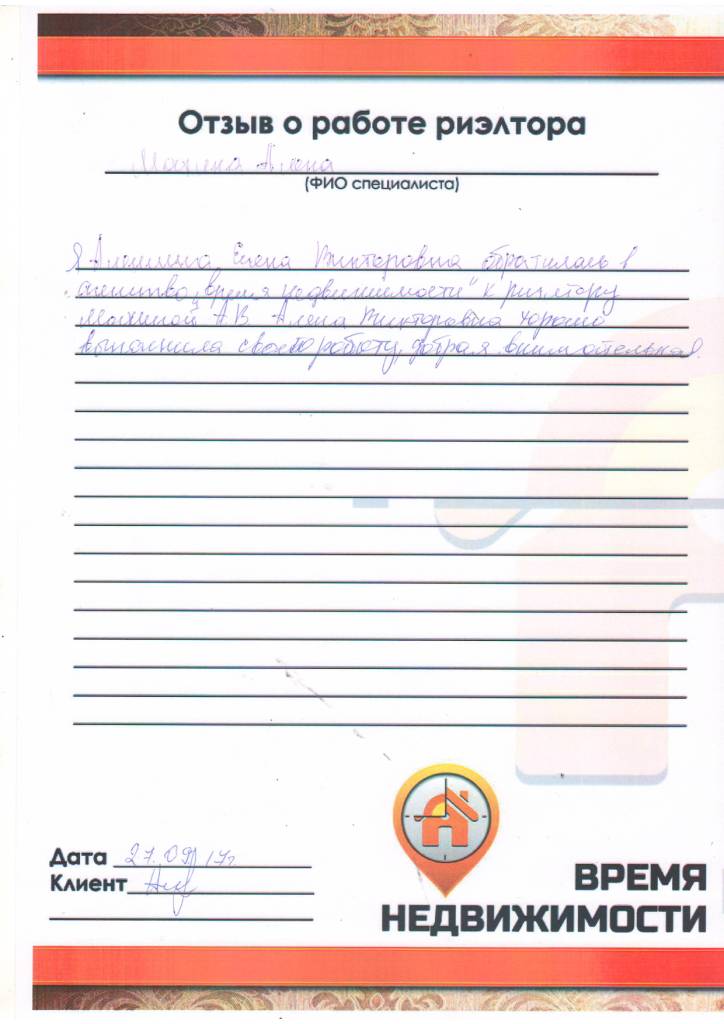 Я обратилась в агентство "Время Недвижимости" к риэлтору Махиной А.В..