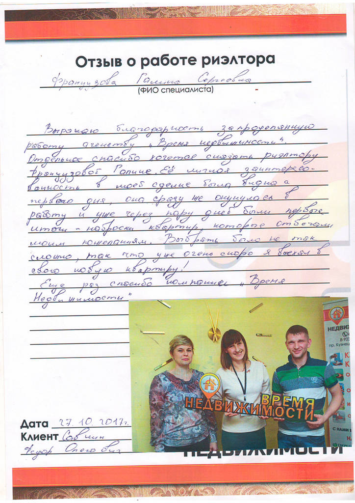 Выражаю благодарность за проделанную работу агентству АН "Время недвижимости". Отдельное спасибо хочется сказать риэлтору Французовой Галине. ЕЕ личная заинтересованность в моей сделке была видна с первого дня, она сразу же окунулась в работу, и уже через пару дней были первые итоги - наброски квартир, которые отвечали моим пожеланиям. Выбрать было не так сложно, так что уже очень скоро я въехал в свою новую квартиру! Еще раз спасибо компании "Время недвижимости".