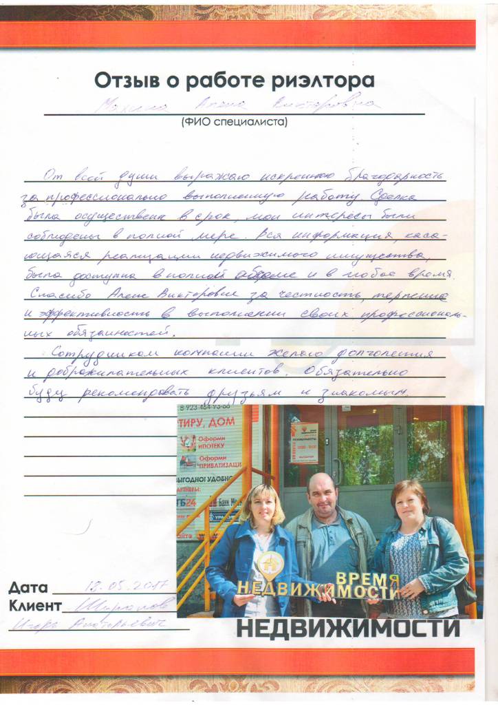 От всей души выражаю искреннюю благодарность за профессионально выполненную работу. Сделка была осуществлена в срок, мои интересы были соблюдены в полной мере. Спасибо Алене Викторовне за честность, терпение и эффективность в выполнении своих профессиональных обязанностей.