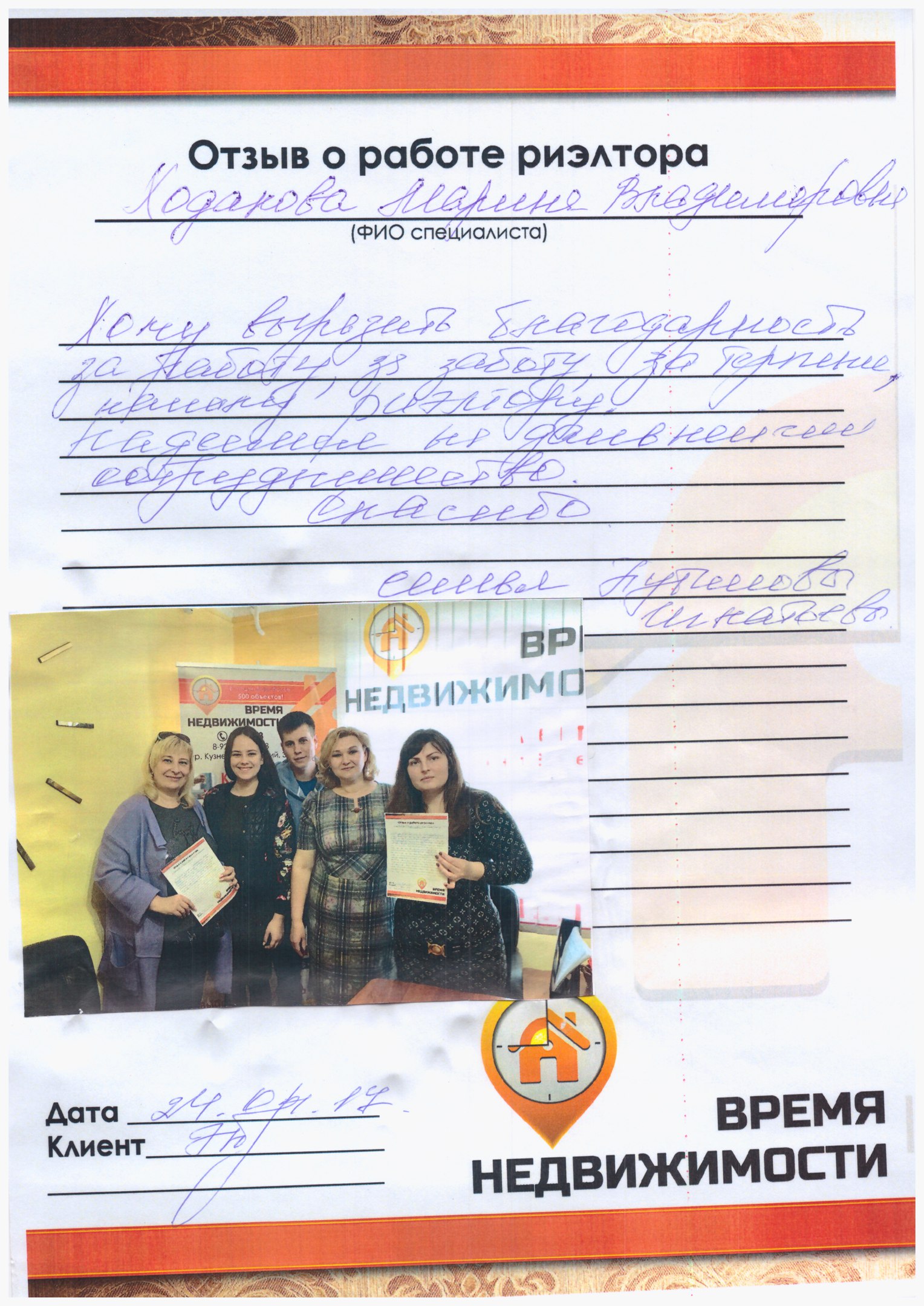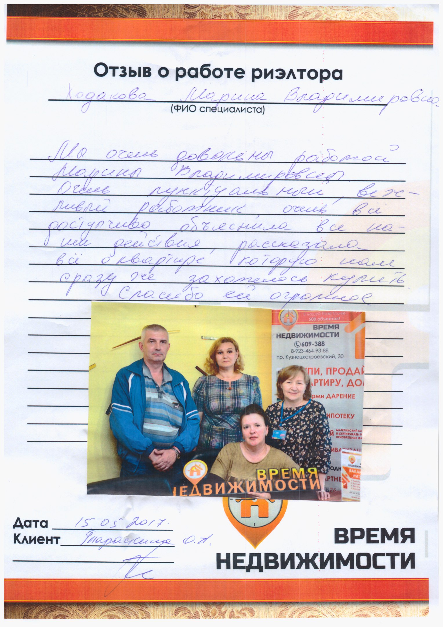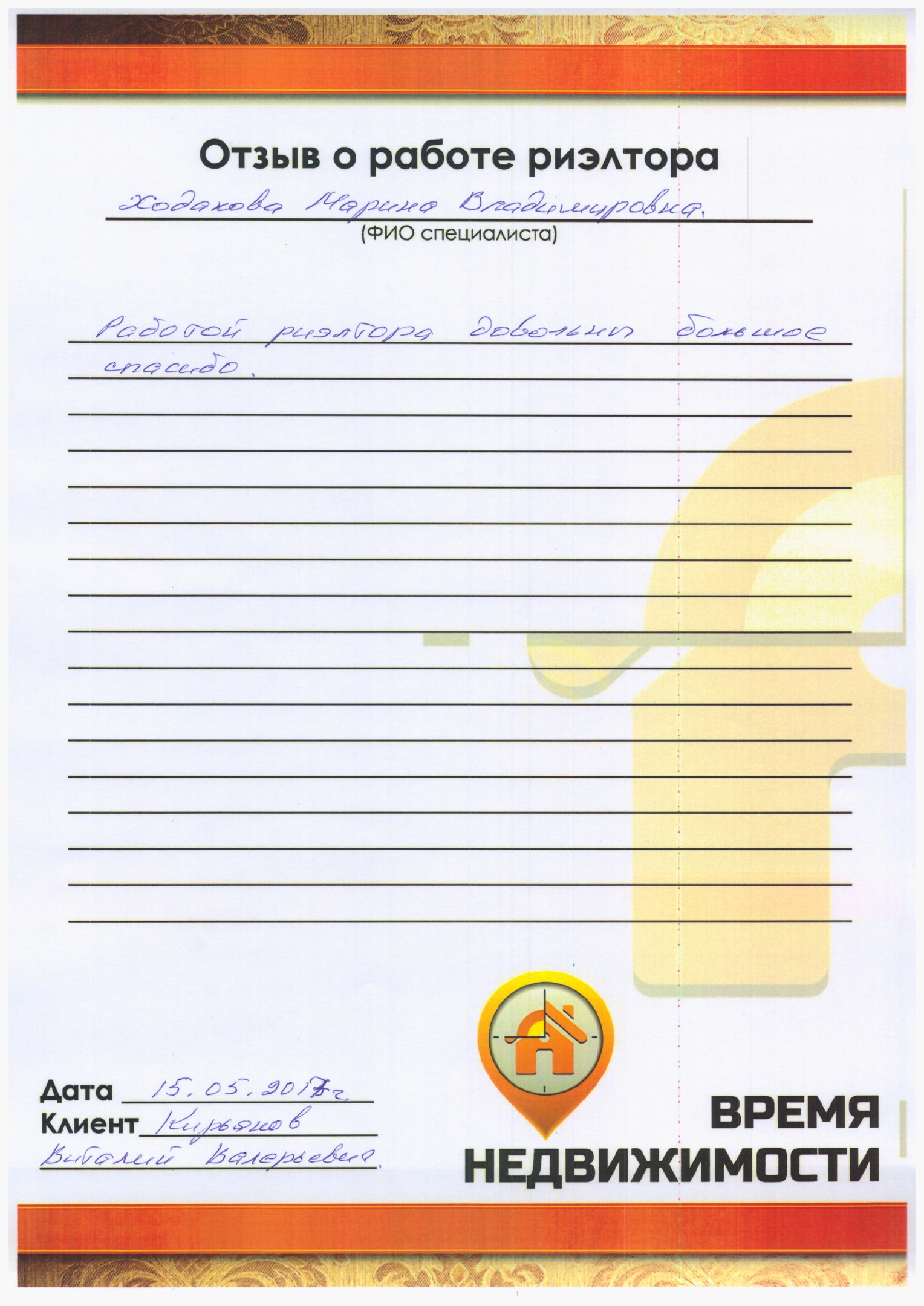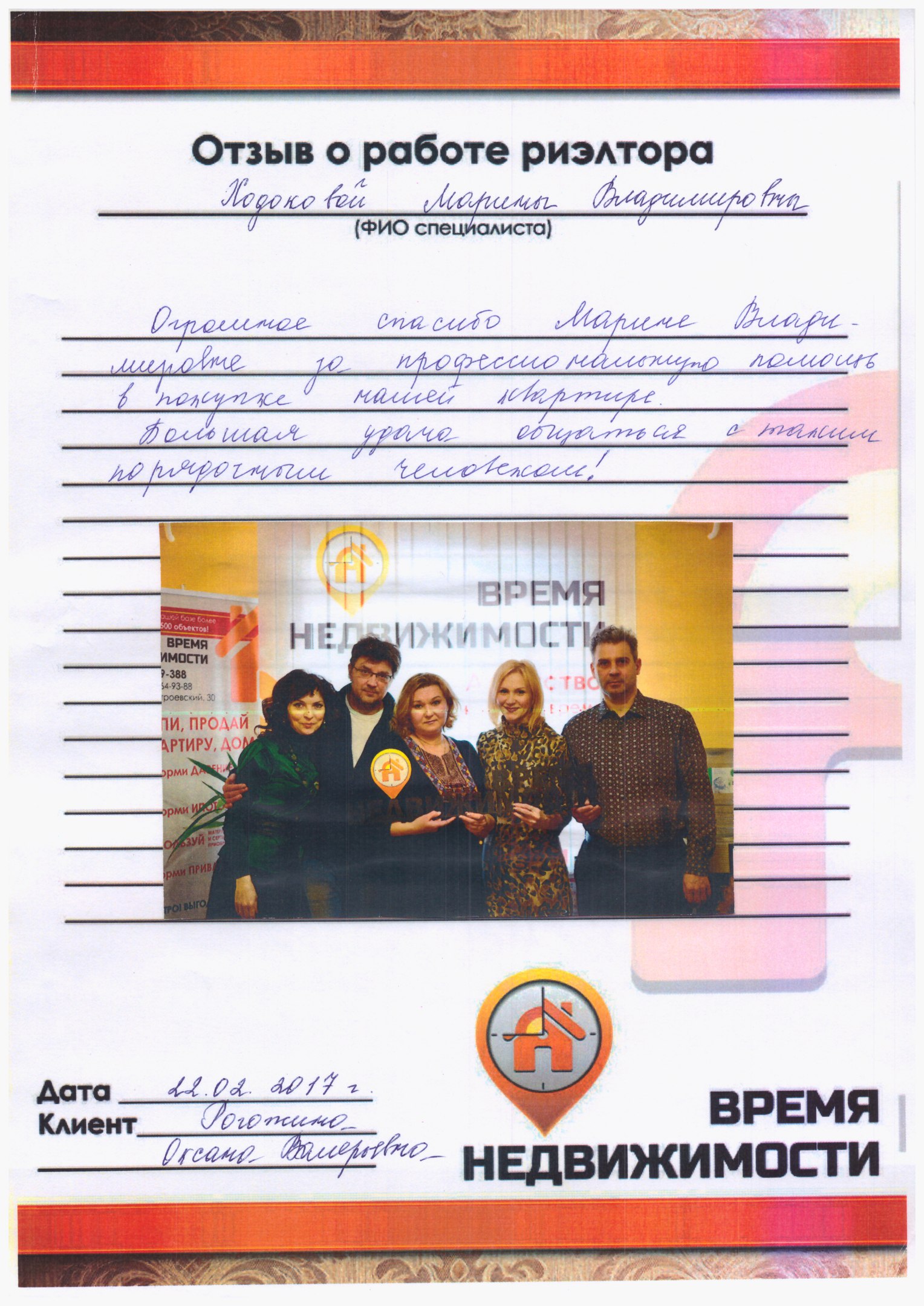 Огромное спасибо Марине Ходаковой за профессиональную помощь в покупке нашей квартиры. Большая удача общаться с такими порядочными людьми!