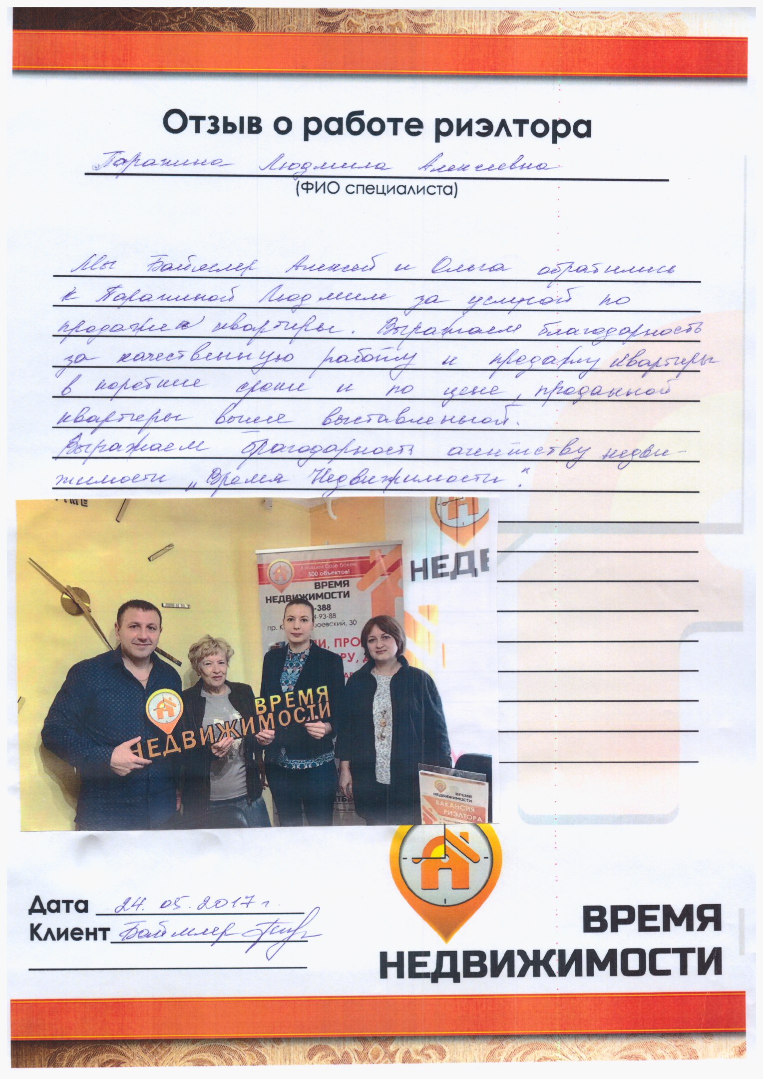 Хочу выразить благодарность за работу, за заботу, за терпение нашему риэлтору!