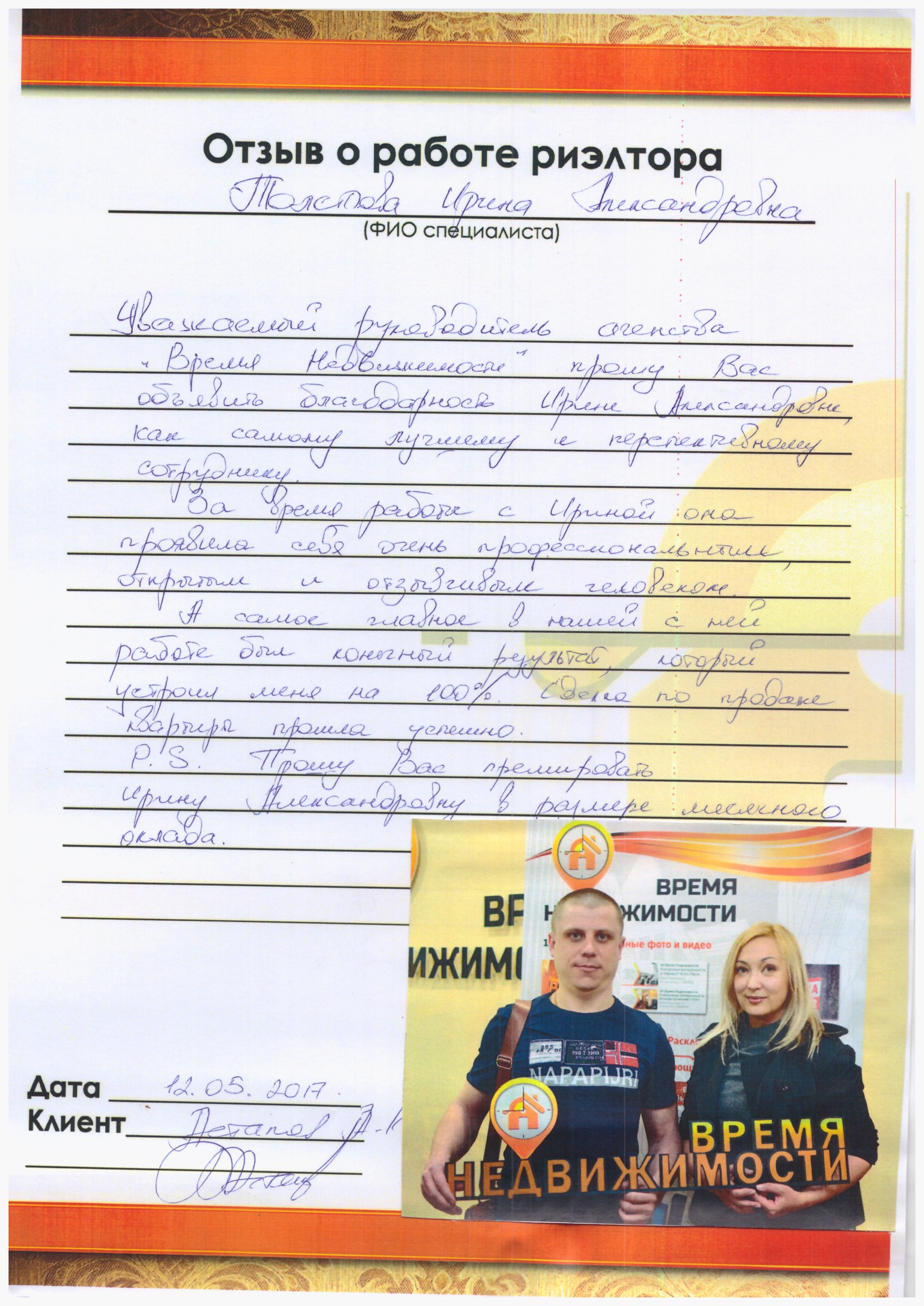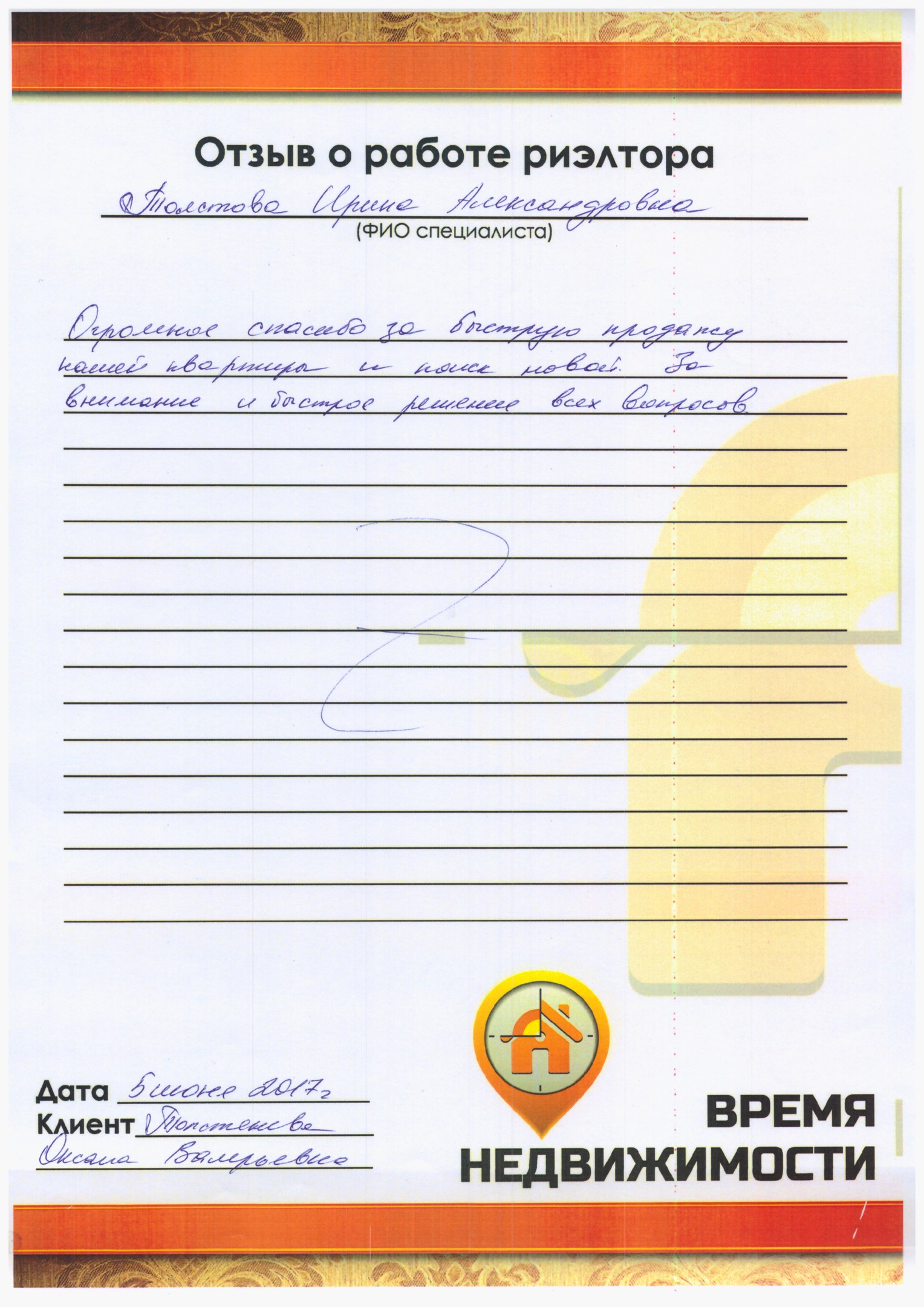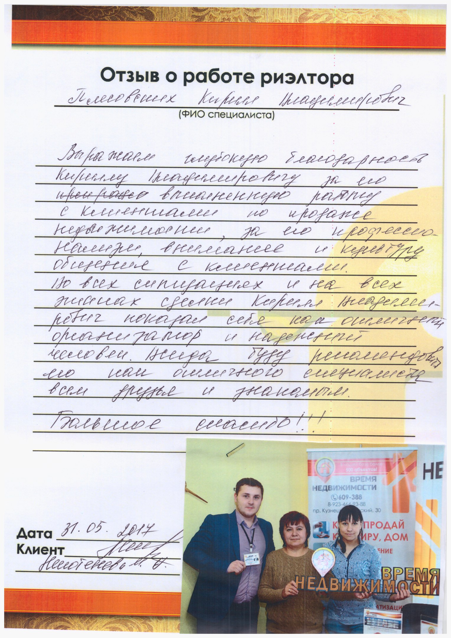 Выражаем глубокую благодарность Кириллу Плесовских за его выполненную работу с клиентами по продаже недвижимости. За его профессионализм, внимание и культуру общения с клиентами.