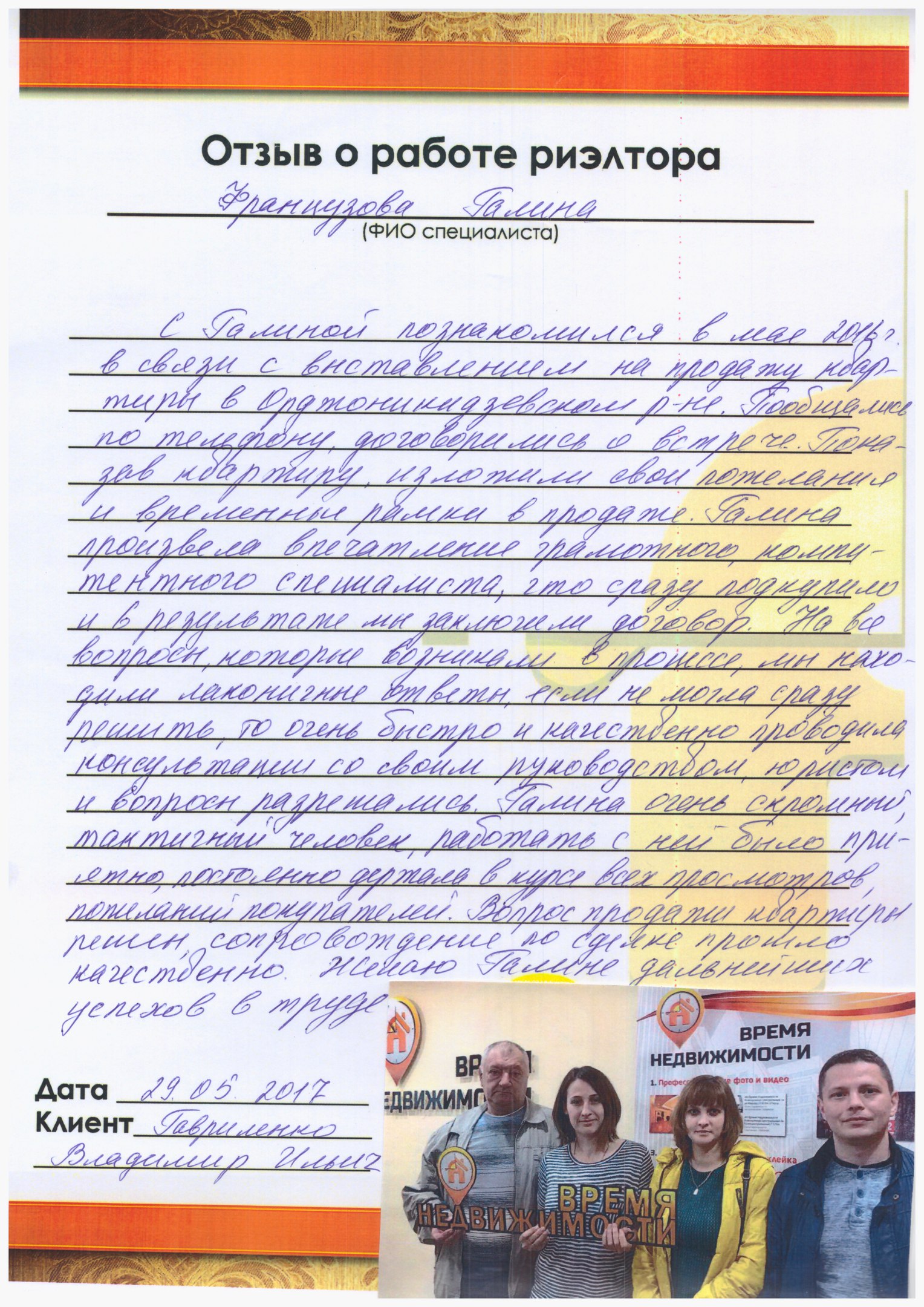 Галина - очень скромный, тактичный человек, работать с ней было одно удовольствие, постоянно держала в курсе всех просмотров, пожеланий покупателей.