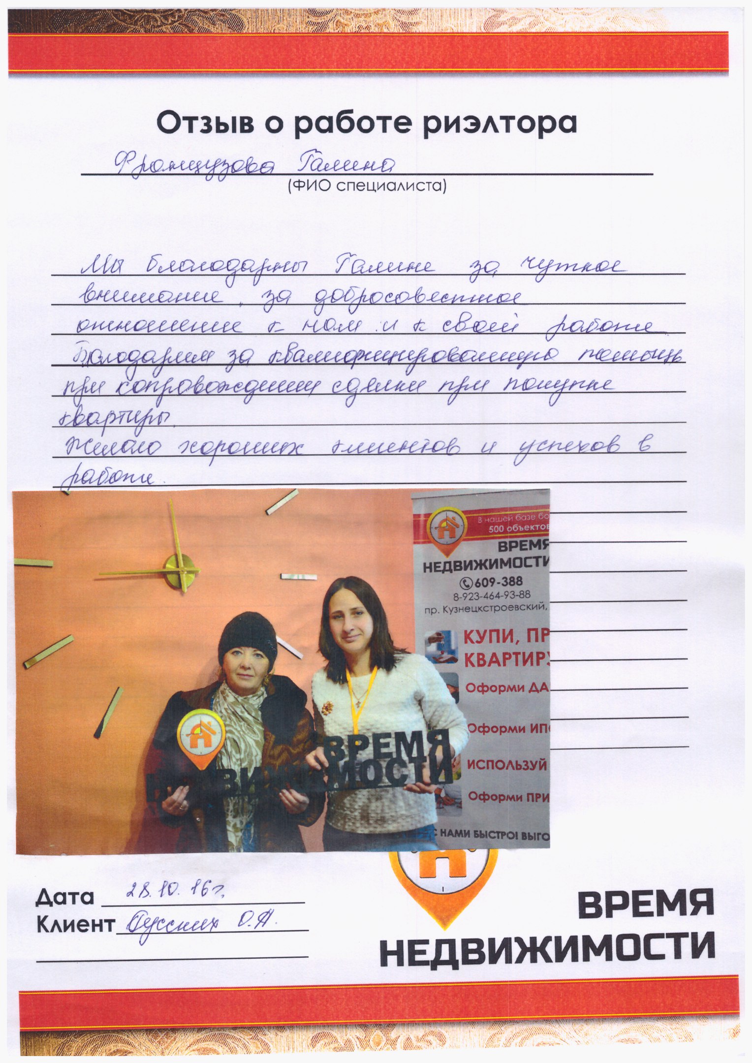 Мы благодарны Галине за чуткое внимание, за добросовестное отношение к нам и к своей работе. Благодарим за квалифицированную помощь при сопровождении сделки при покупке квартиры. Желаем хороших клиентов и успехов в работе!