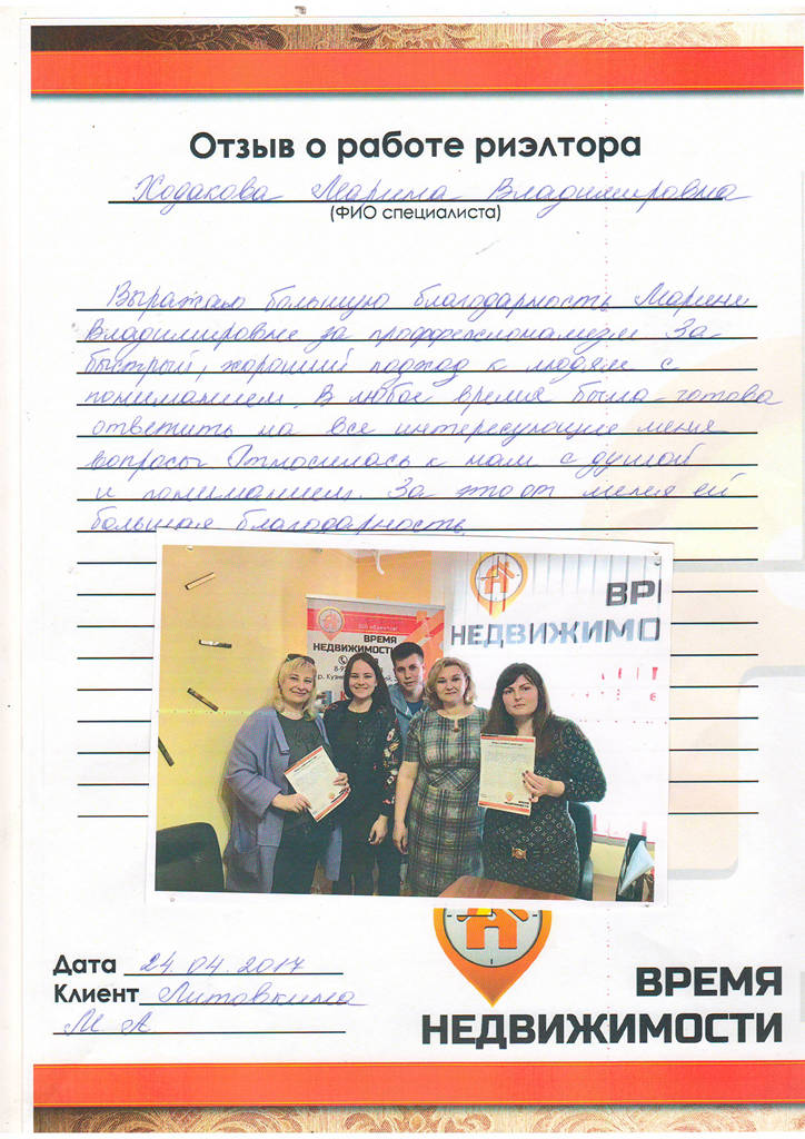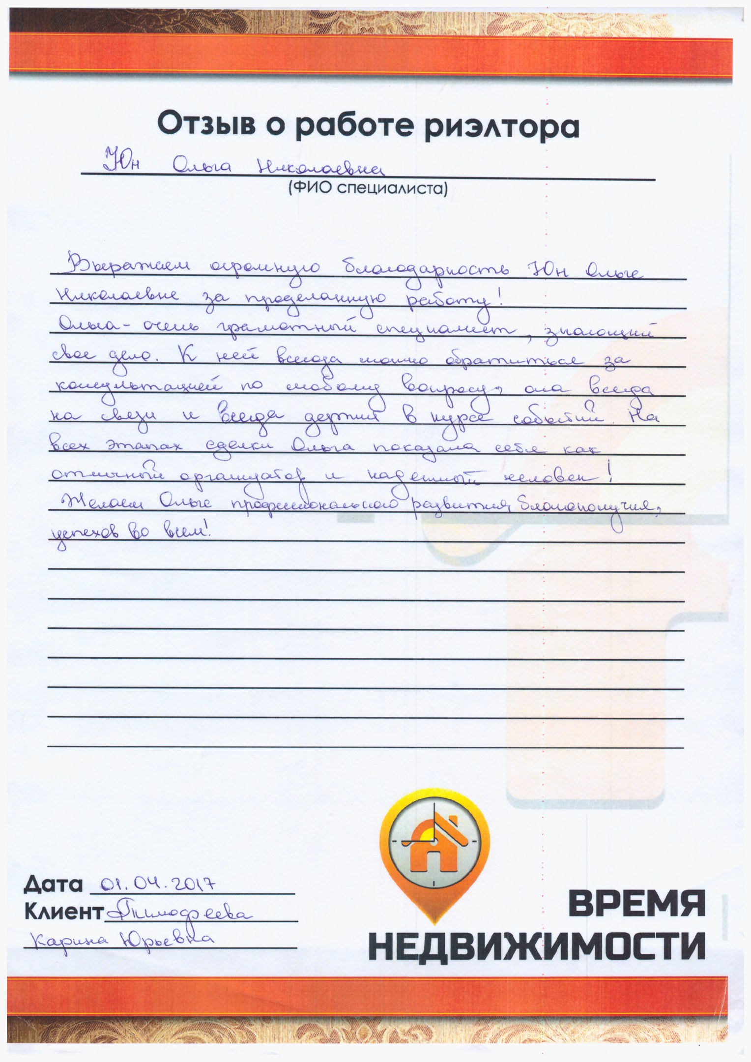 Выражаем огромную благодарность Юн Ольге за проделанную работу! Она - очень грамотный специалист, знающий свое дело. К ней всегда можно обратиться за консультацией по любому вопросу. Она всегда на связи и всегда держит в курсе событий.