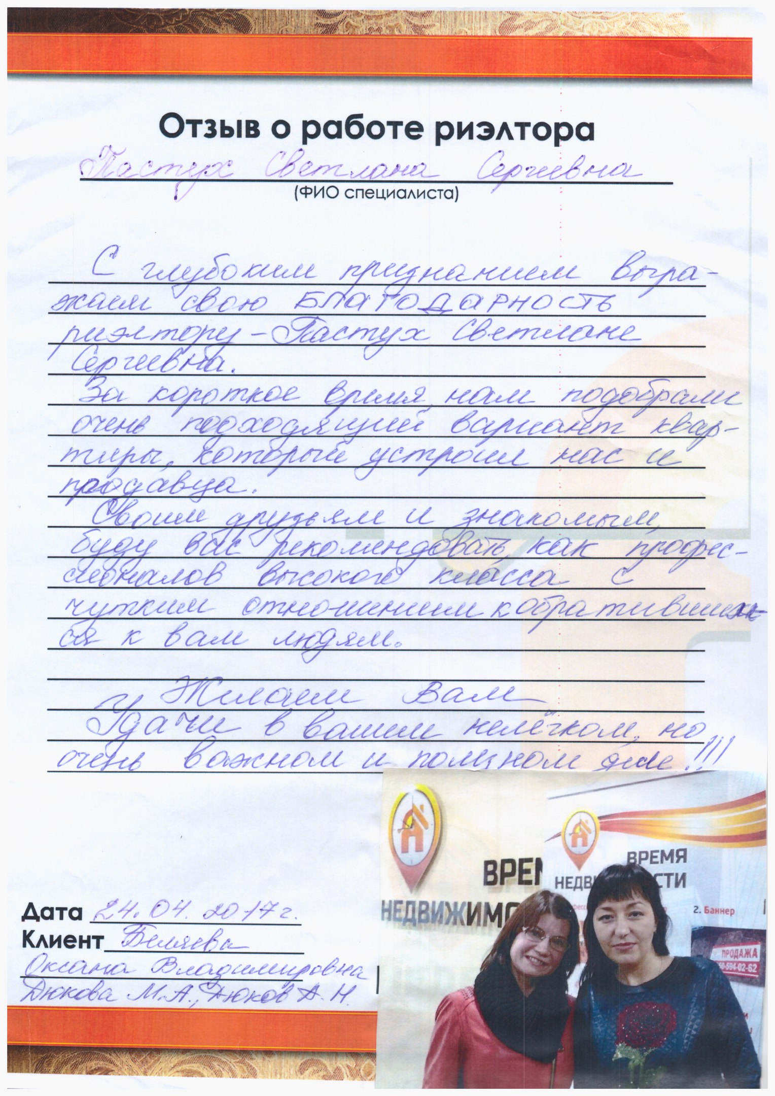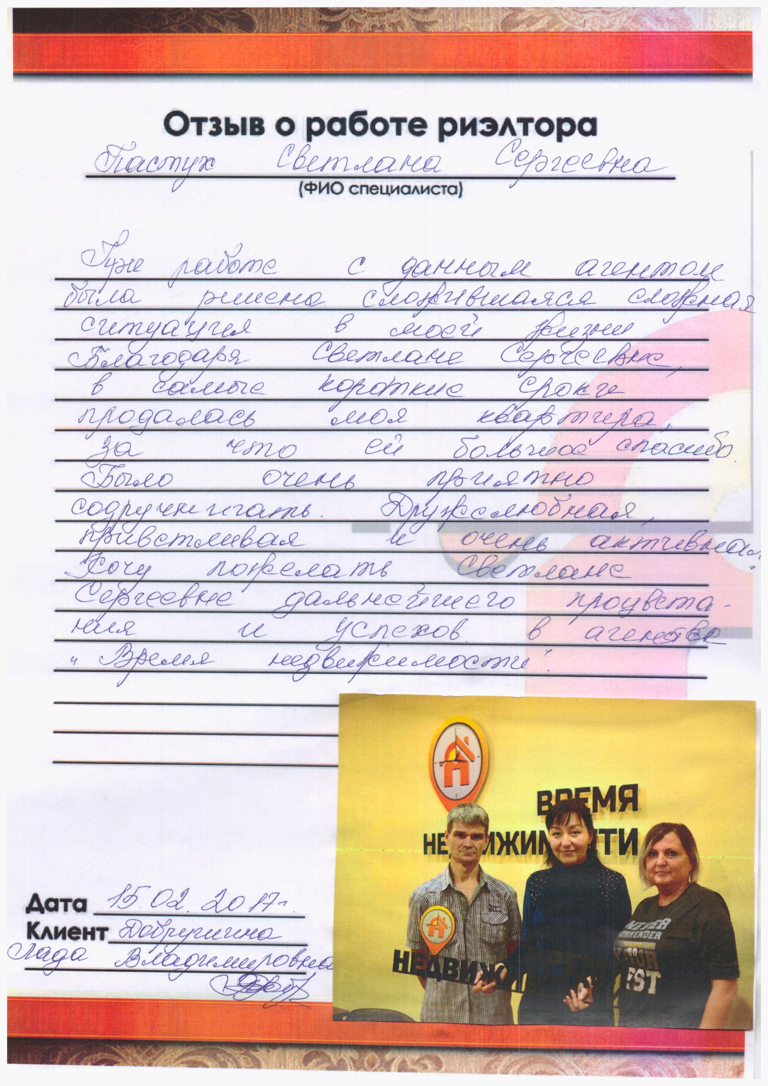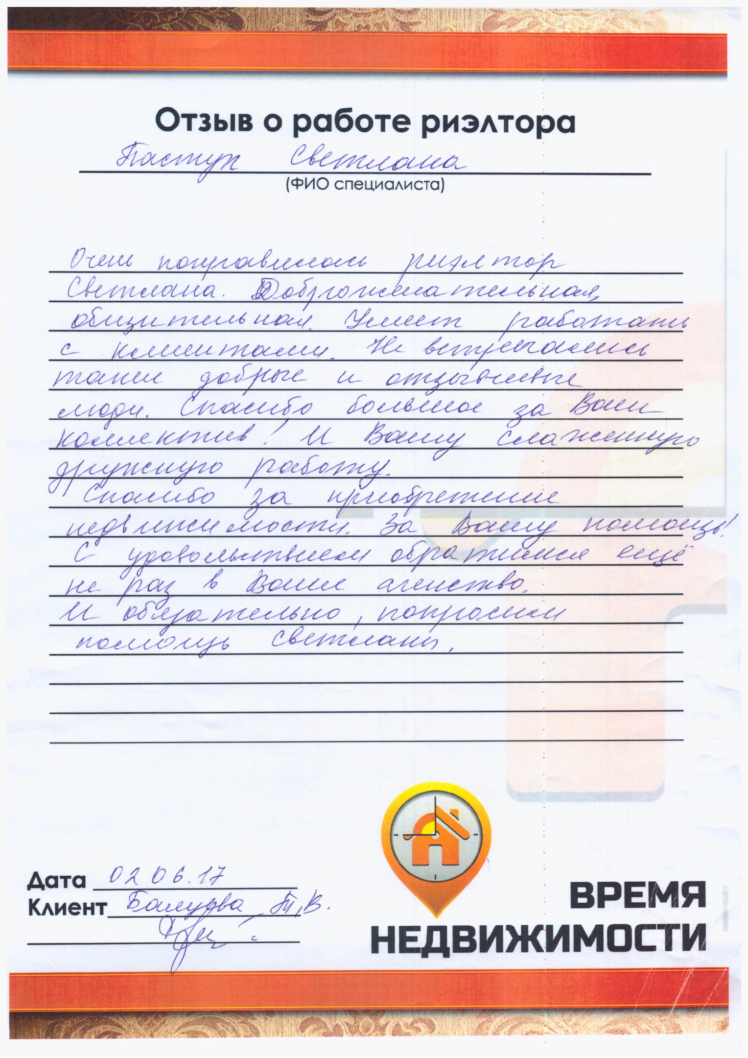 При работе с агентом Пастух Светланой была решена сложившаяся сложная ситуация в моей жизни. Благодаря Светлане, в самые короткие сроки продалась моя квартира. За что ей большое спасибо!