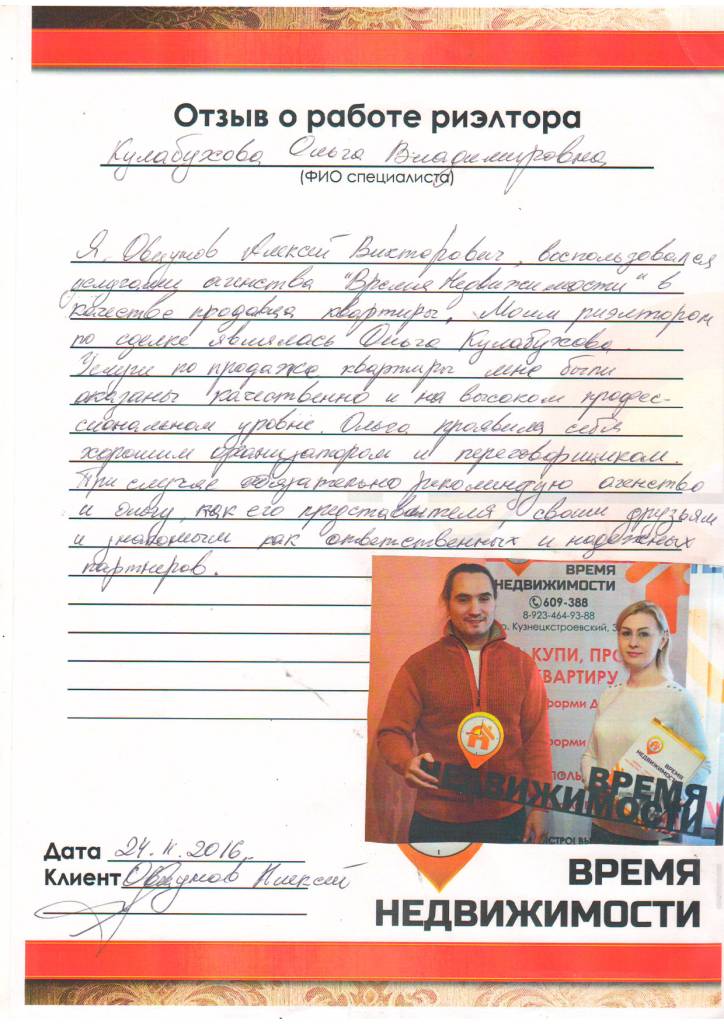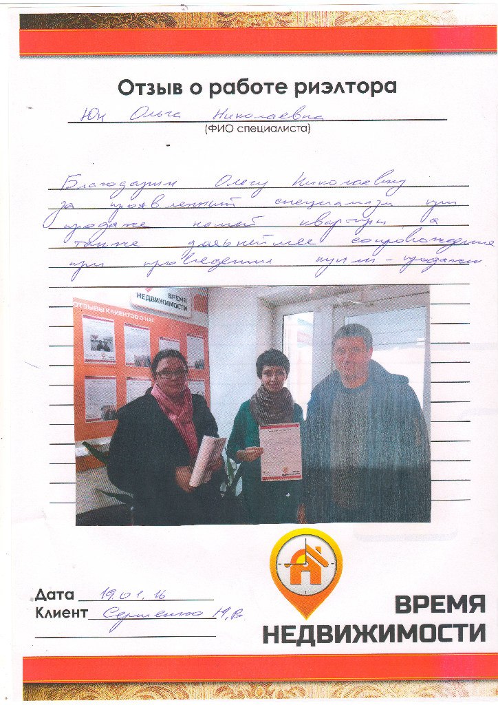 Мы ощутили, что человек знает и любит свое дело, а с такими людьми очень приятно работать. Обязательно буем рекомендовать именно вашего специалиста и ваше агентство "Время недвижимости". Спасибо за приятное сотрудничество!