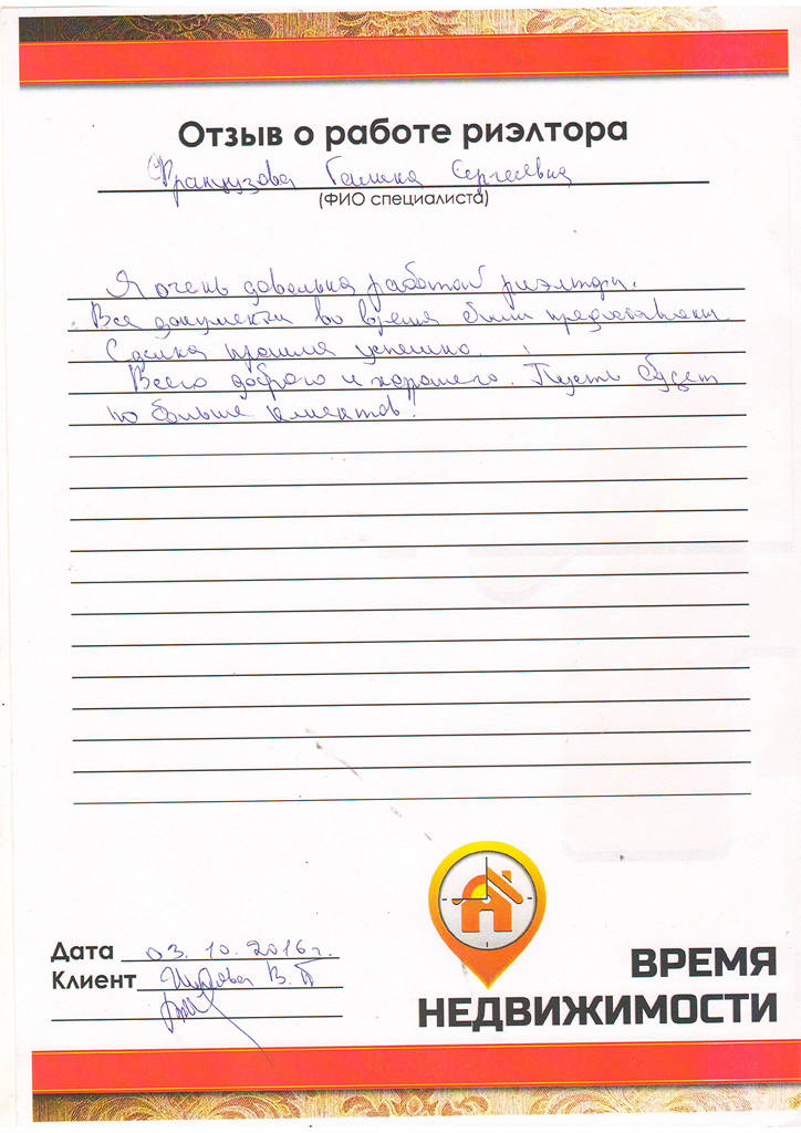 Я очень довольна работой риэлтора. Все документы были предоставлены вовремя. Сделка прошла успешно. Всего доброго и хорошего. Пусть будет побольше клиентов!