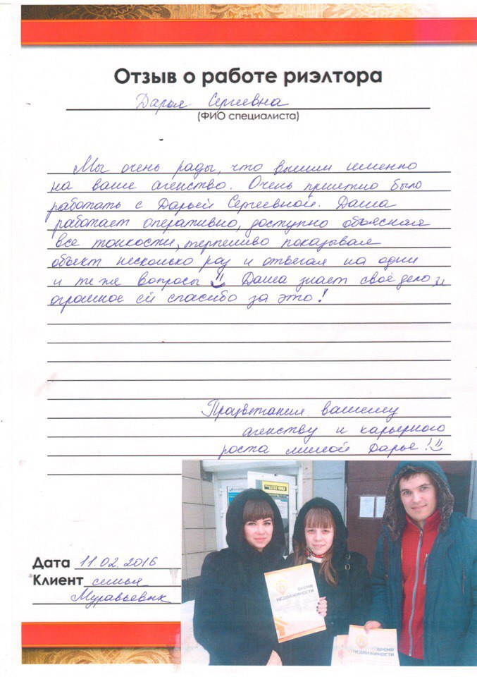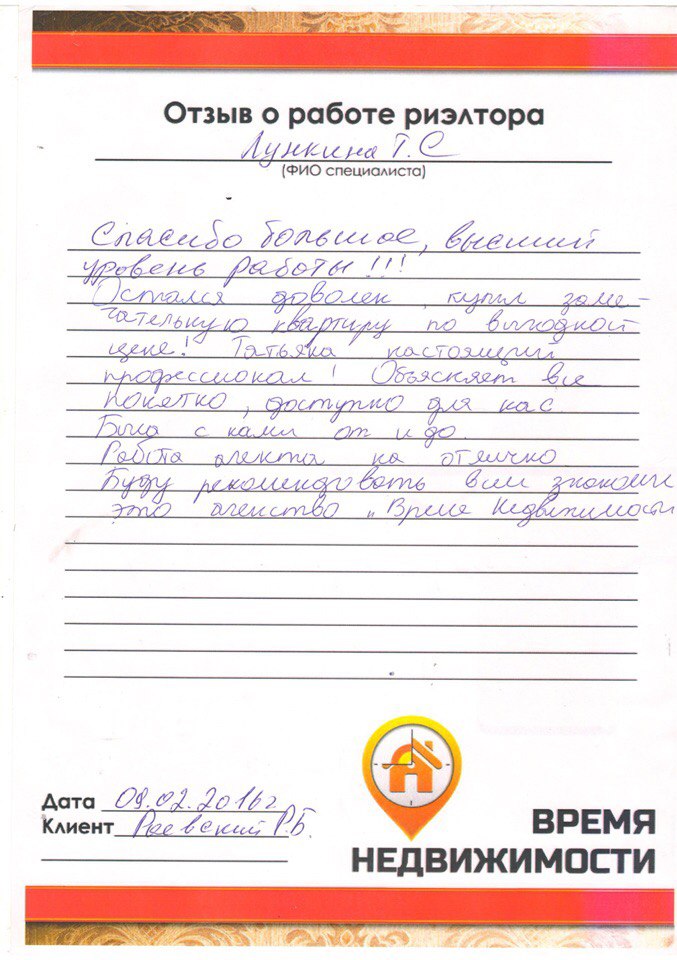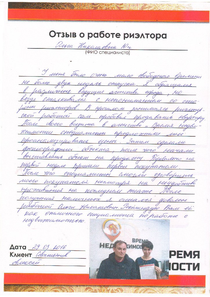 Отзыв о работе риэлтора АН «Время Недвижимости»