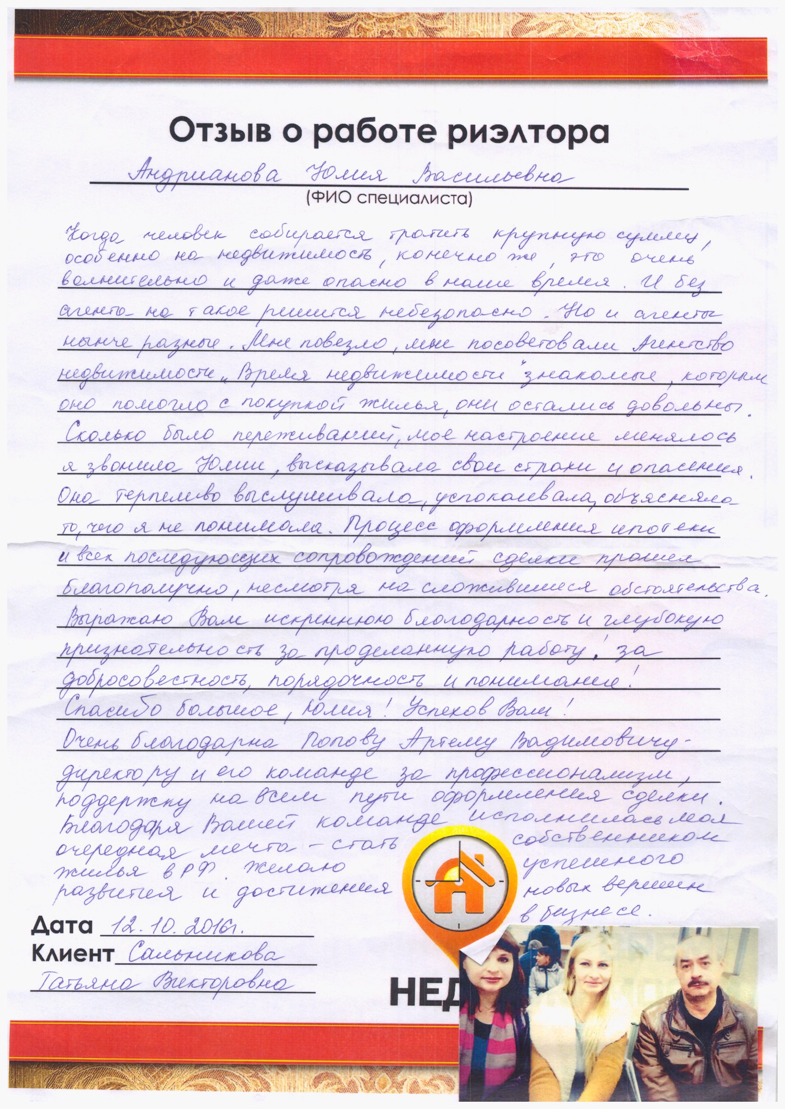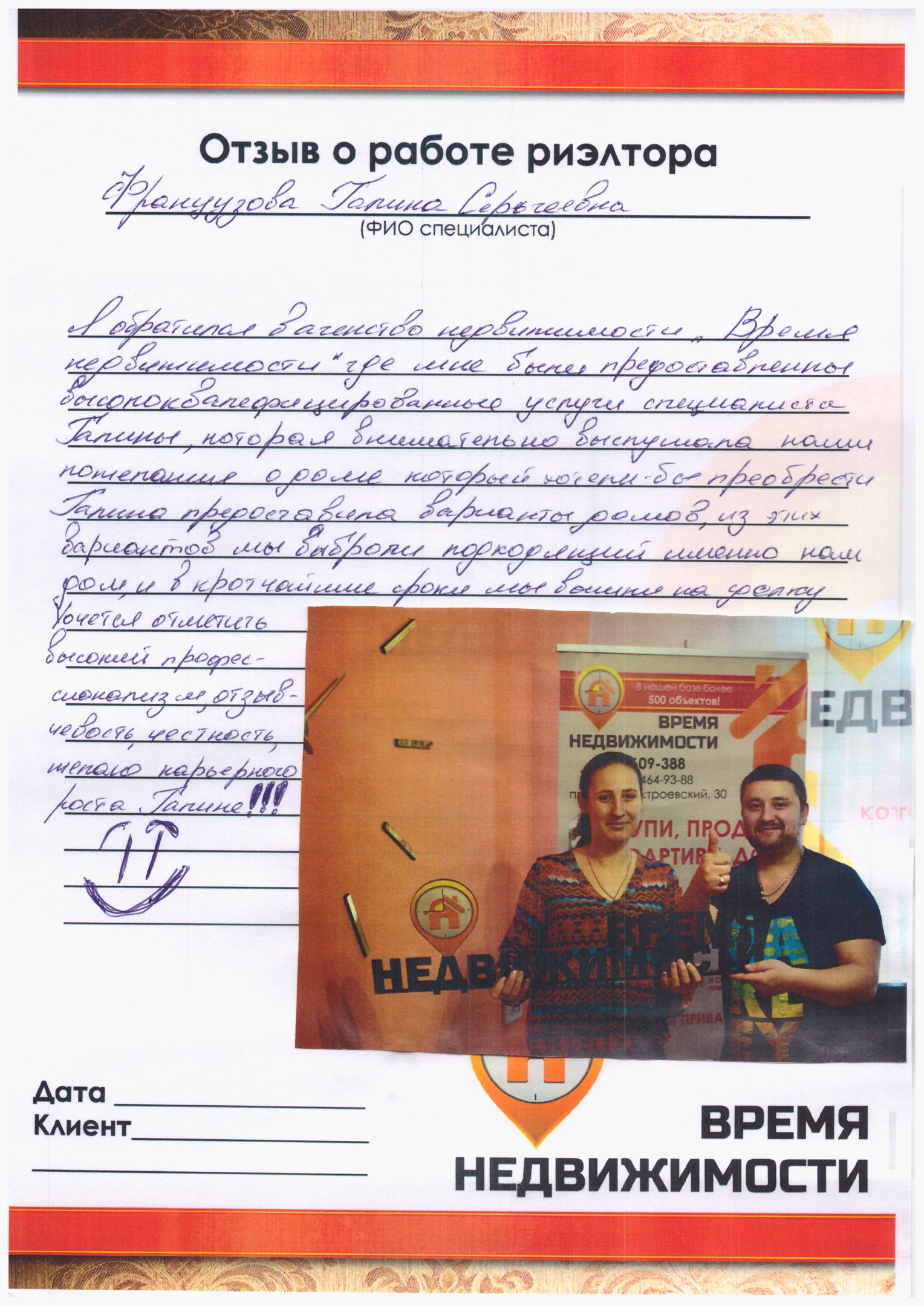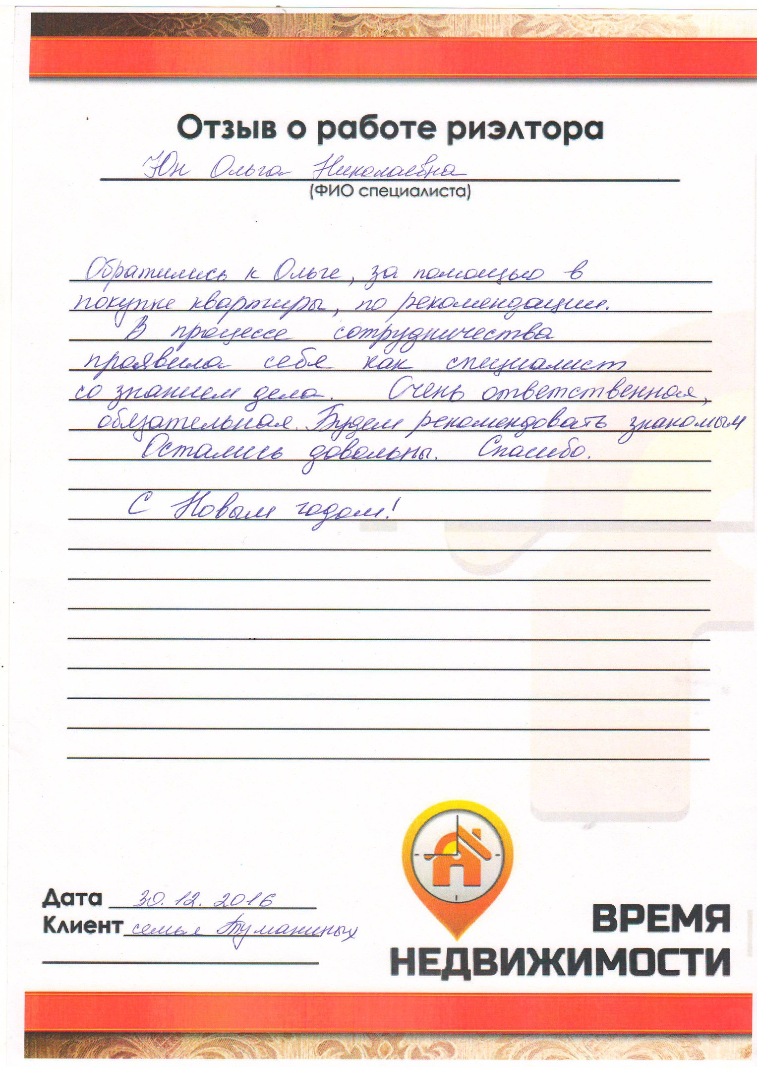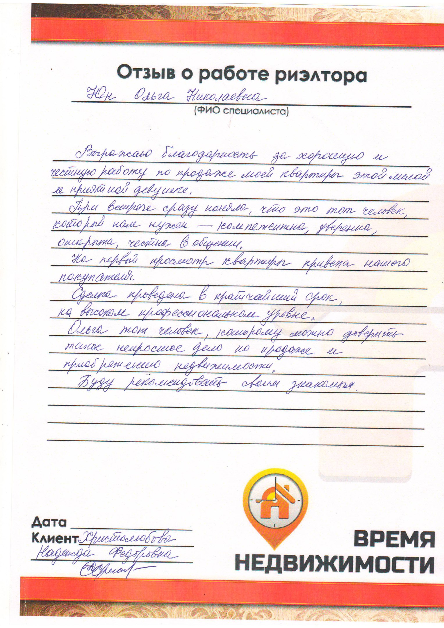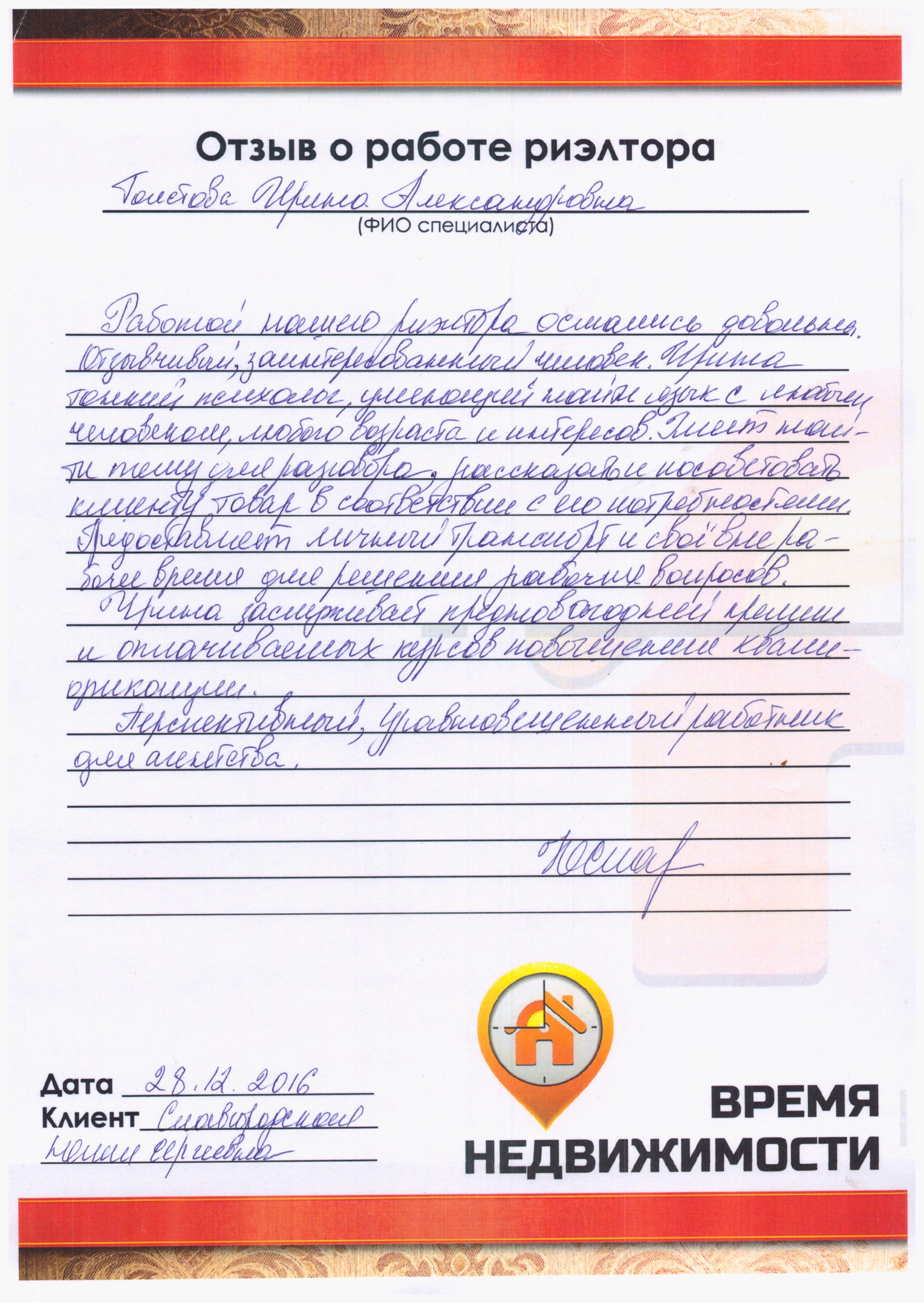 Работой нашего риэлтора остались довольны. Отзывчивый, заинтересованный человек. Ирина - тонкий психолог, умеющий найти общий язык с любым человеком, любого возраста и интересов