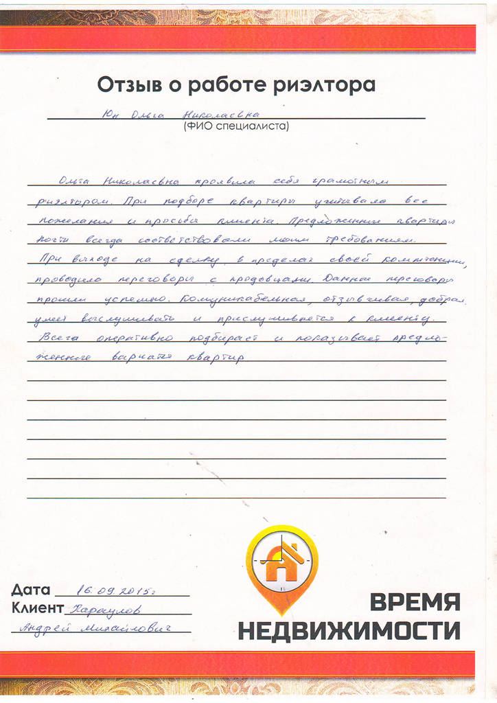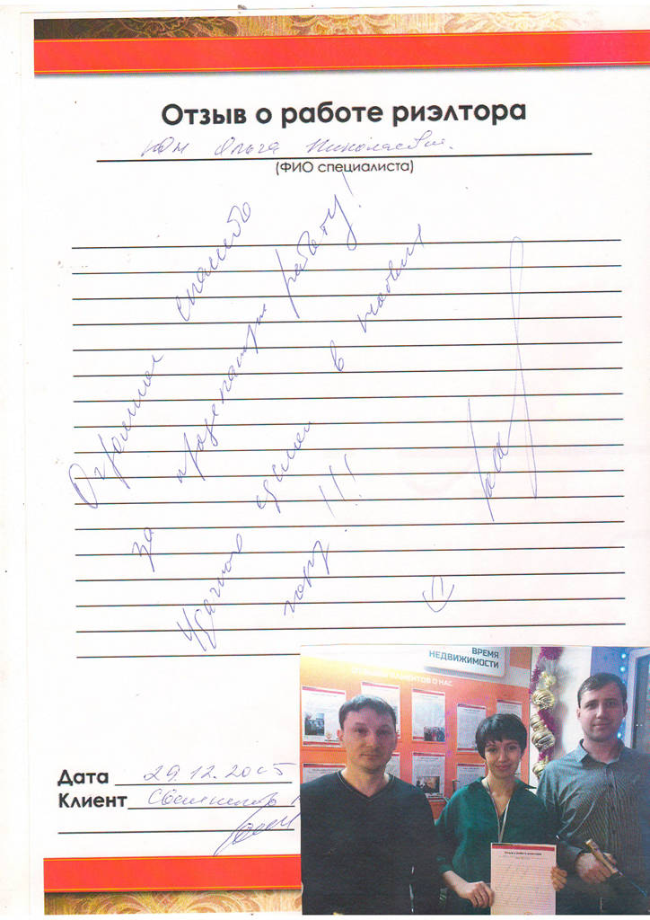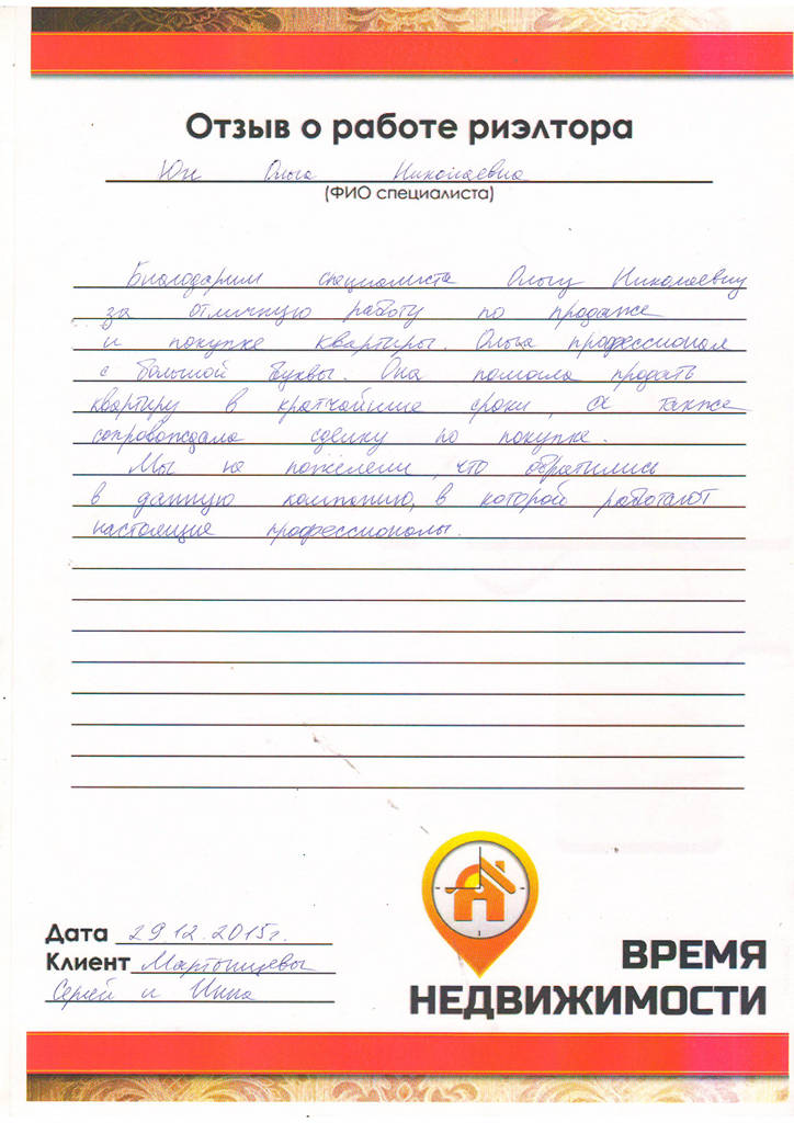 Отзыв клиента АН "Время Недвижимости" г. Новокузнецк, Новокузнецк