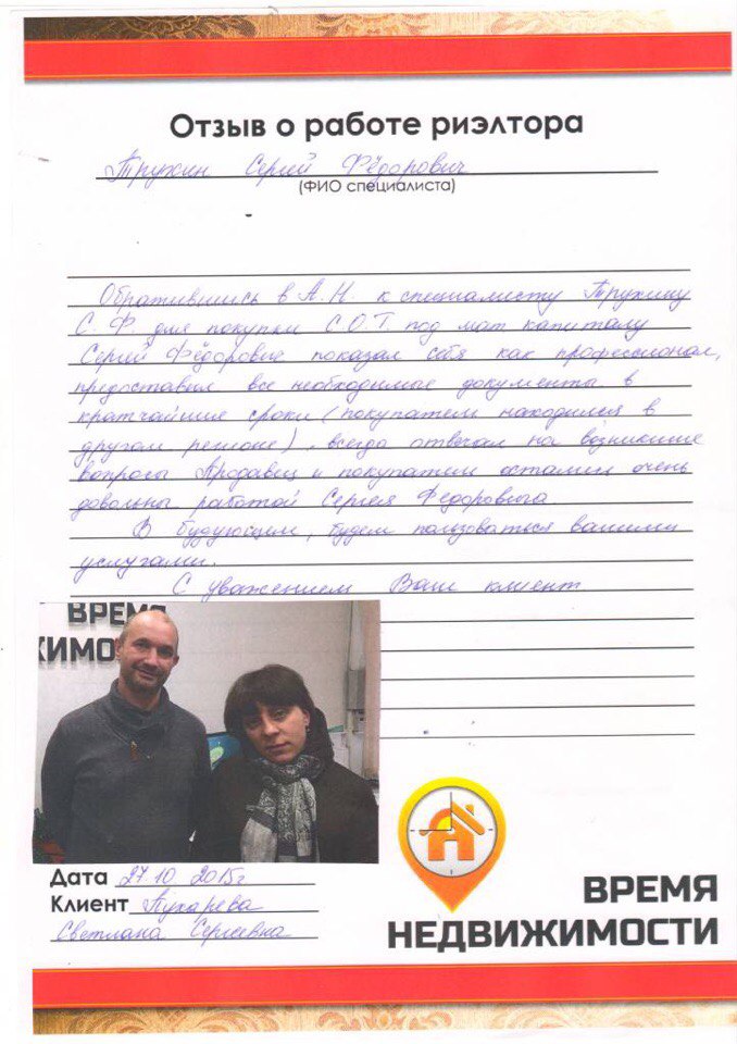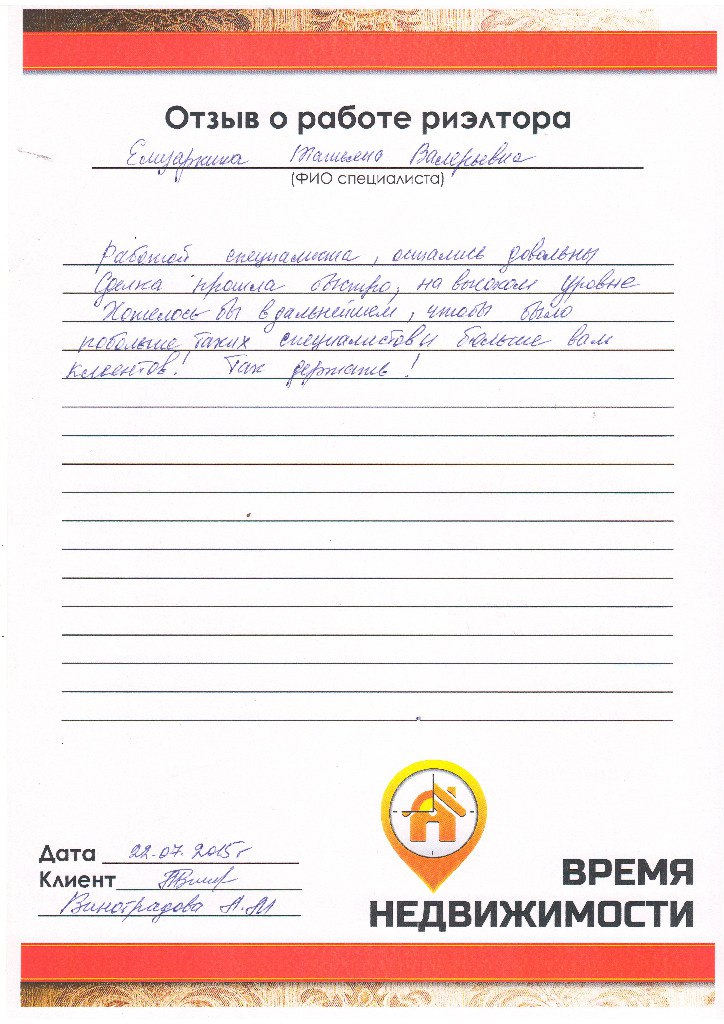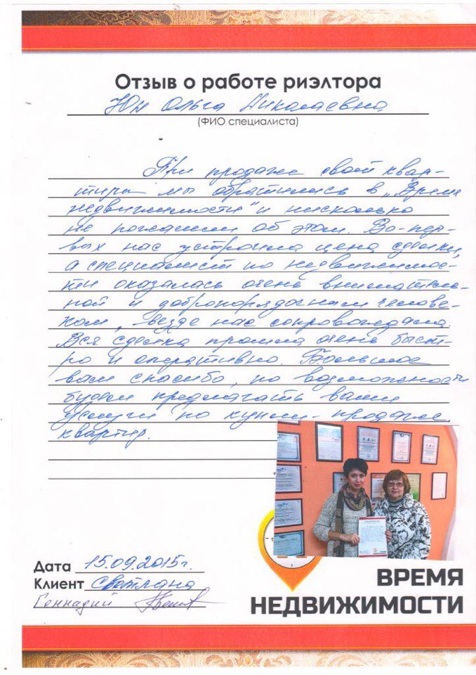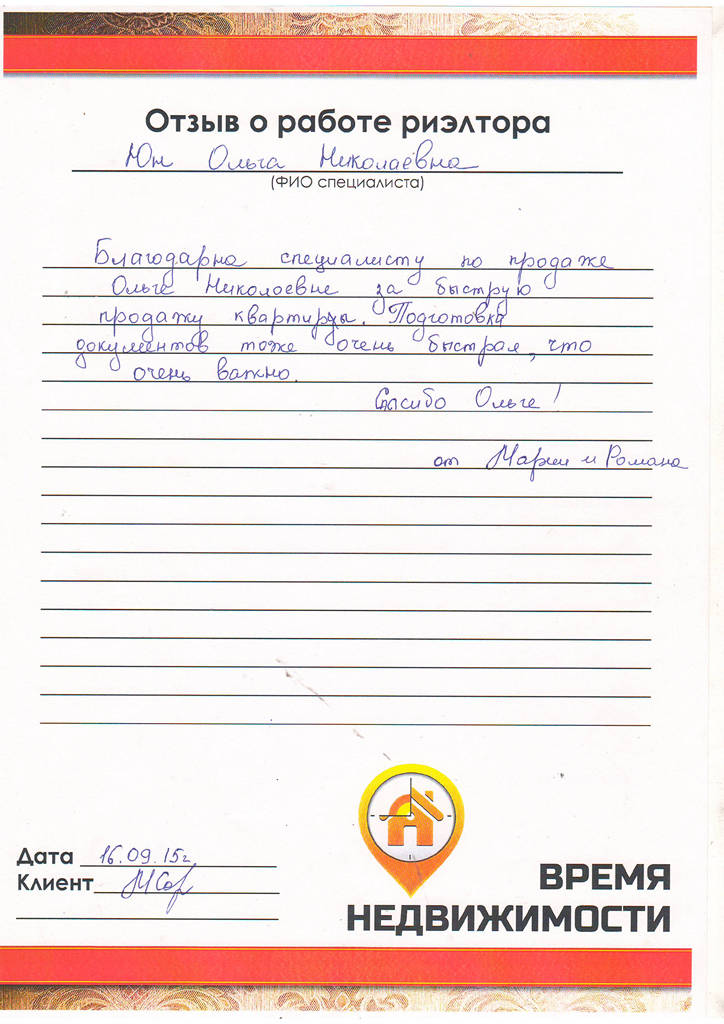 Благодарна специалисту Ольге Николаевне за быструю продажу квартиры. Подготовка документов была тоже очень быстрой, что крайне важно. Спасибо Ольге!