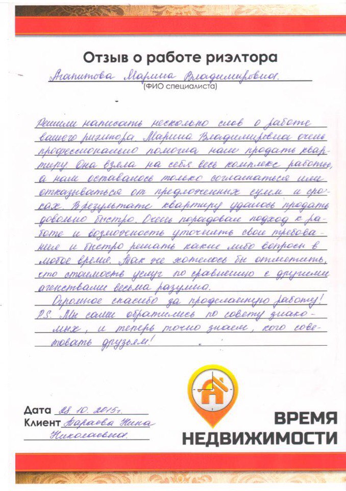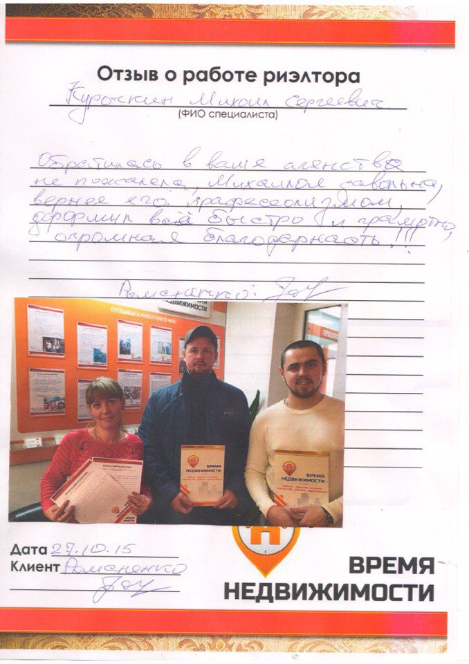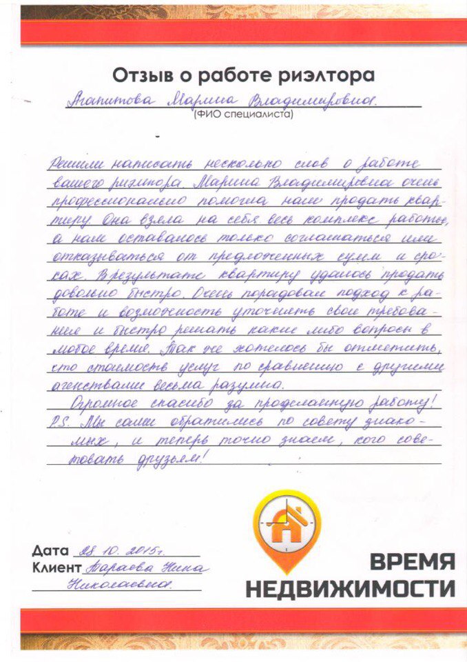 Я обратилась в фирму «Время Недвижимости» с просьбой о продаже мой двухкомнатной квартиры. Осталась очень довольна работой всей компании во главе с Поповым Артемом Вадимовичем. Грамотные люди, доброжелательные, очень внимательные.