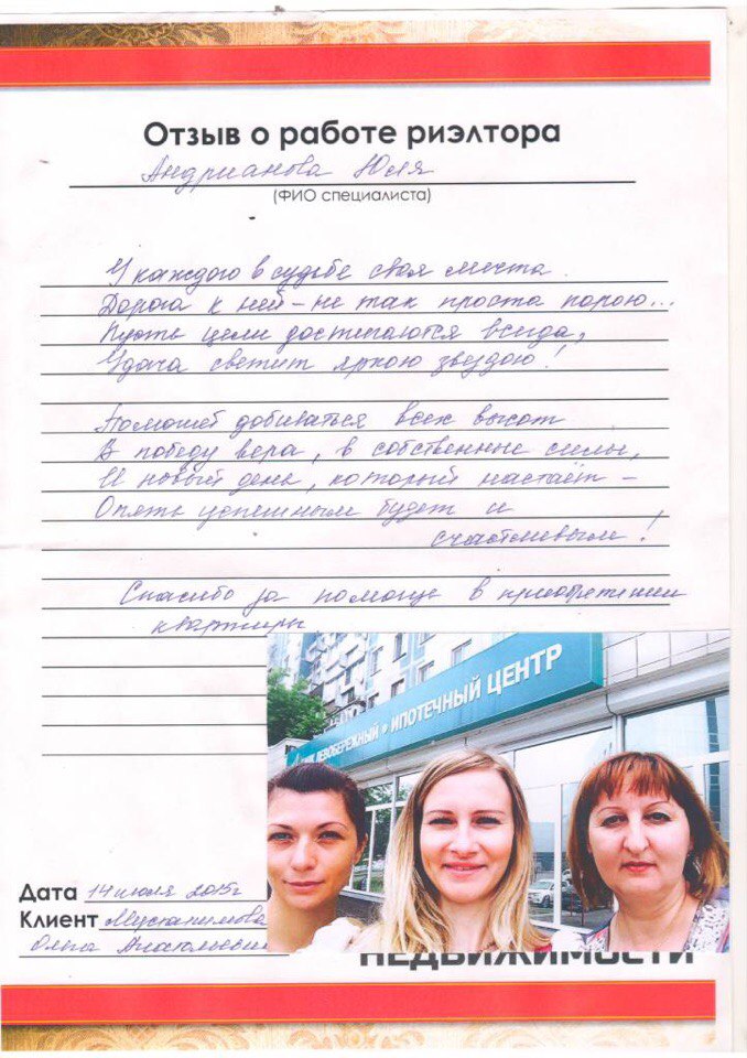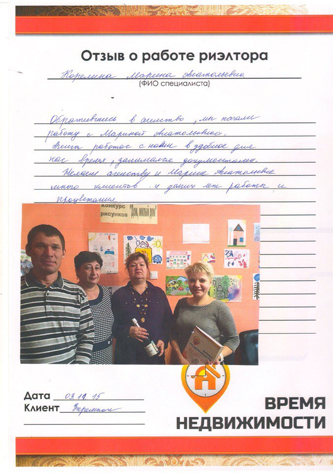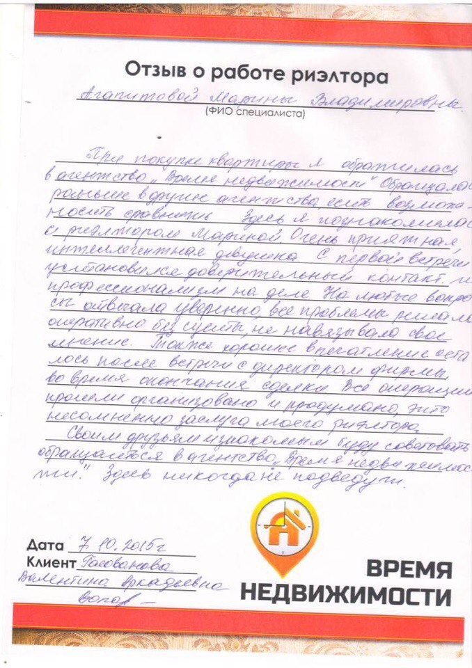 Благодарность риэлтору АН «Время Недвижимости»