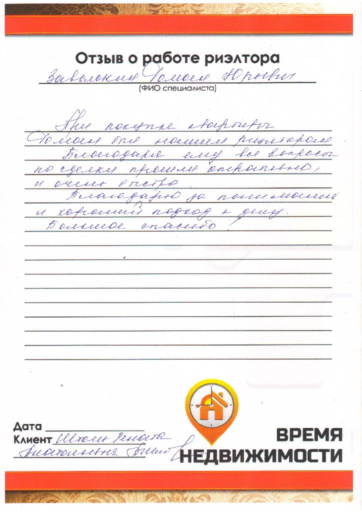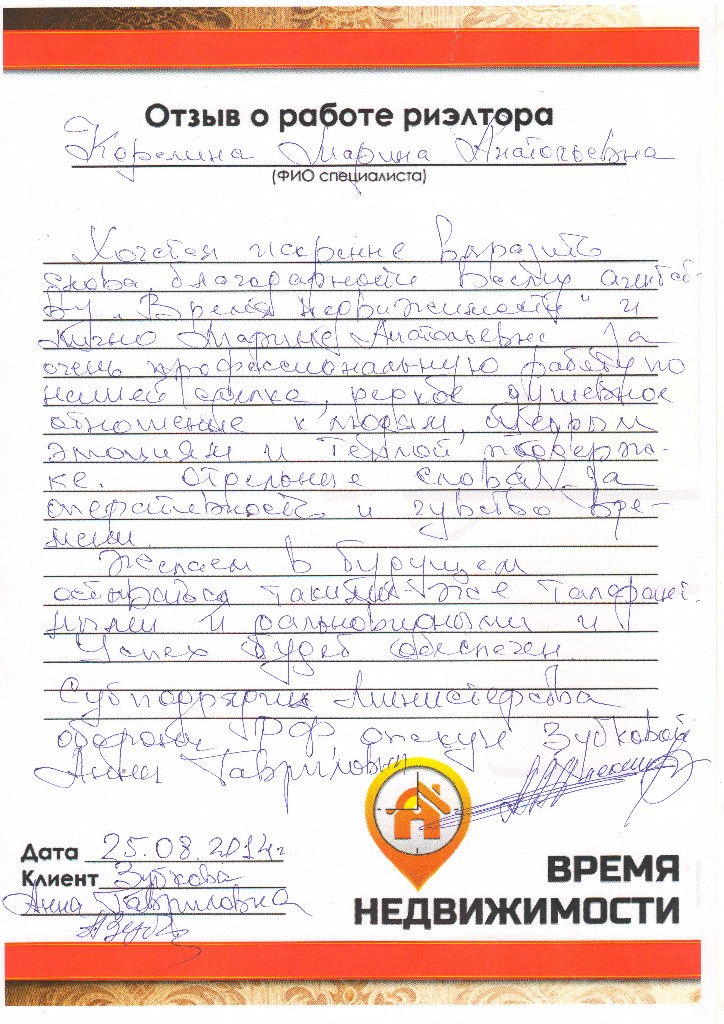 Благодарность риэлтору АН «Время Недвижимости»