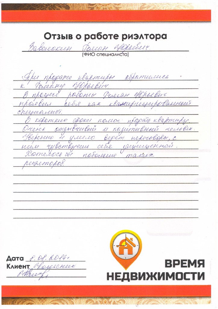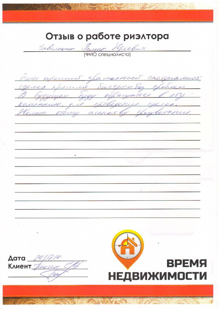Благодарность риэлтору АН «Время Недвижимости» за успешную сделку с недвижимостью